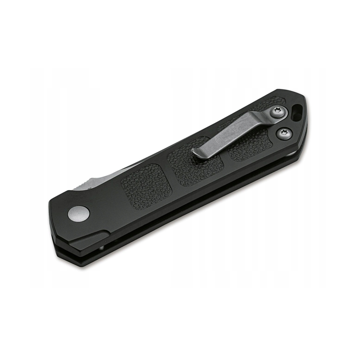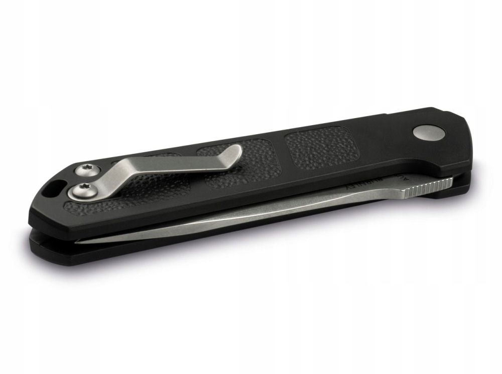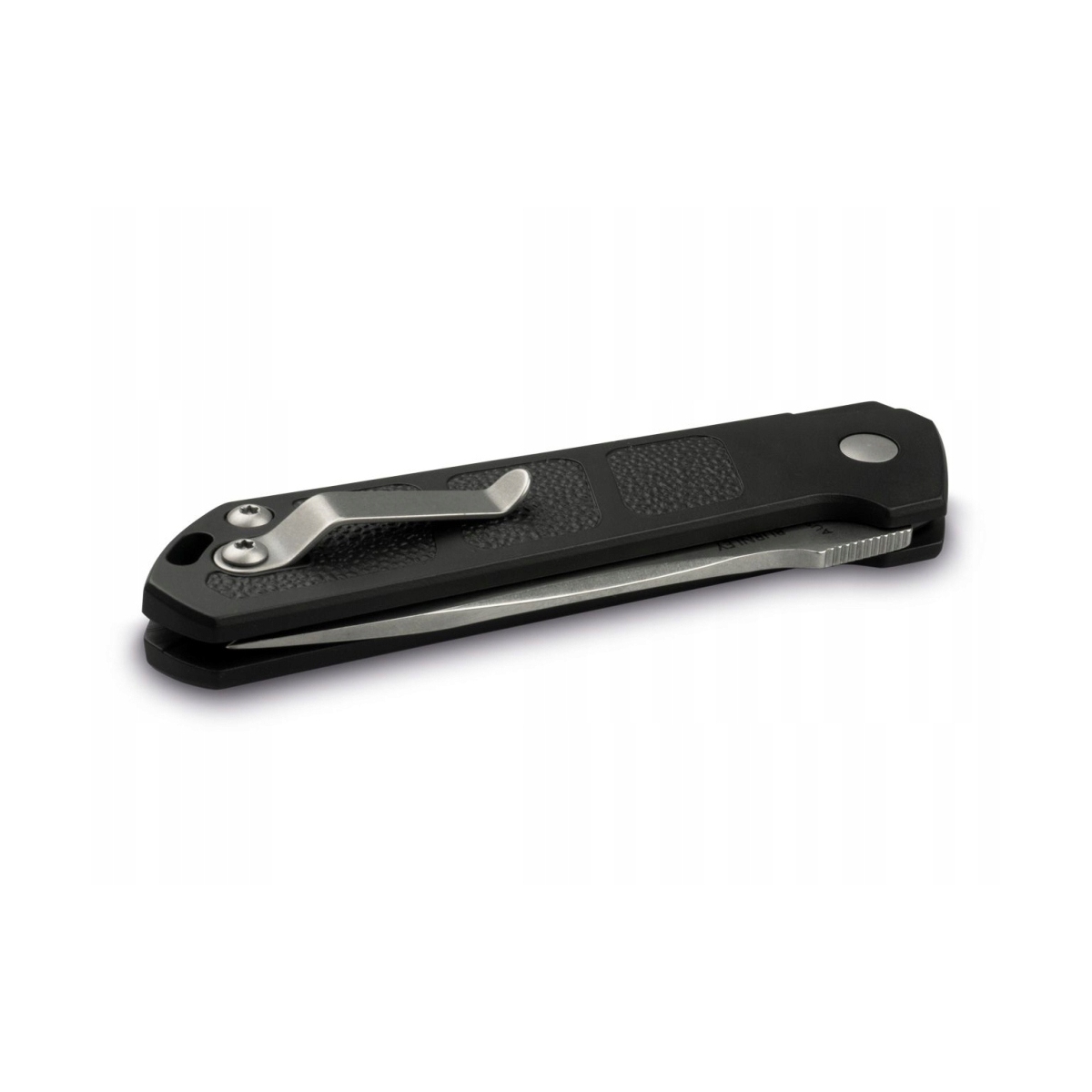 - Stalowy klips przytwierdzony do rękojeści pozwala na zaczepienie noża o krawędź kieszeni lub paska.