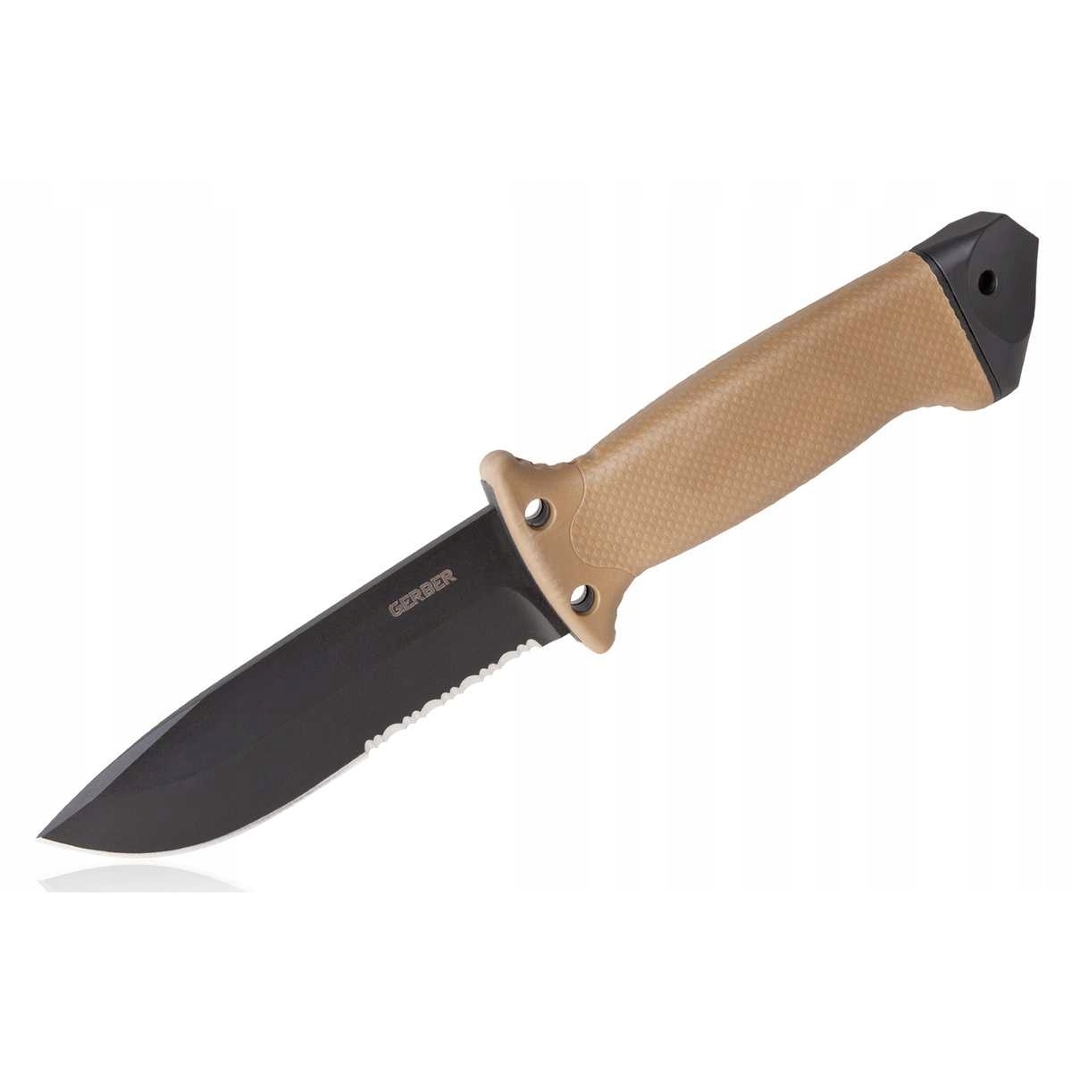 Nóż GERBER LMF II Infantry Limitowany - jest to nóż w wersji limitowanej USA w kolorze coyote, który został przetestowany w warunkach bojowych. Jedyne 30 sztuk dostępnych w Polsce w kolorze Coyote. Konstrukcja typu full tang, wykonana z stali nierdzewnej 420 HC, o grubość 5 mm sprawdzi się nawet w najcięższych zadaniach. Ostrze fixed (częściowo ząbkowane) jest szczególnie przydatne w trakcie cięcia materiałów włóknistych np. lin, pasów. Rękojeść wykonana z plexiglasu, materiału, wykorzystywanego do konstrukcji amerykańskich śmigłowców bojowych. Antypoślizgowa faktura rękojeści, zapewnia pewny i mocny chwyt. Dodatkowe zabezpieczenie dłoni przed ześlizgnięciem, stanowią dwa jelce. Nóż posiada dodatkowe narzędzie na zakończeniu rękojeści w postaci młotka, którym można w sytuacjach awaryjnych wybić szybę czy wbić gwóźdź.