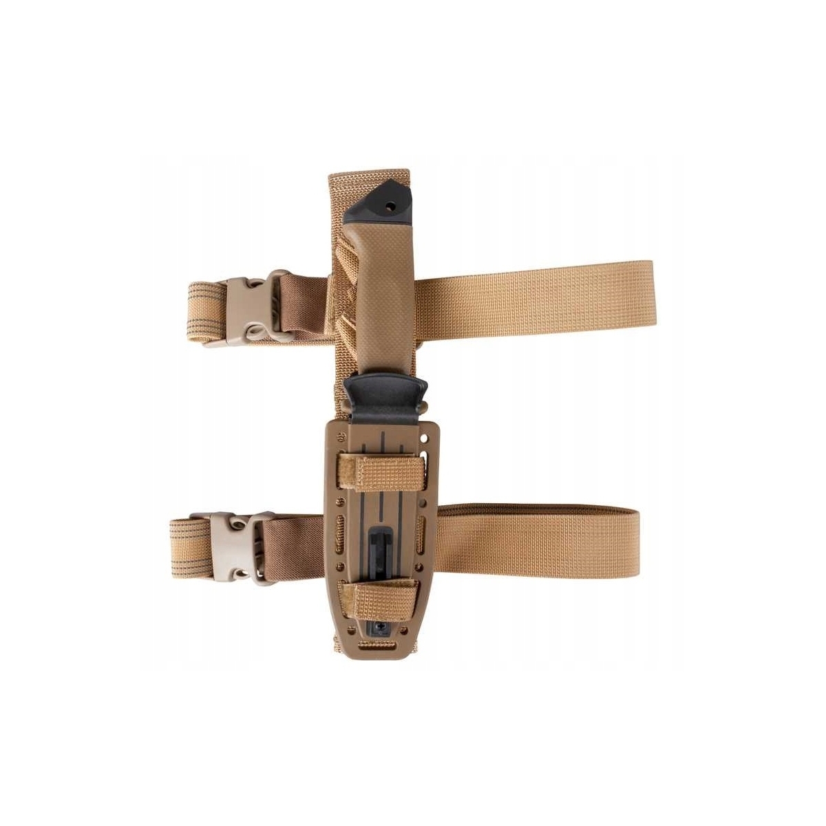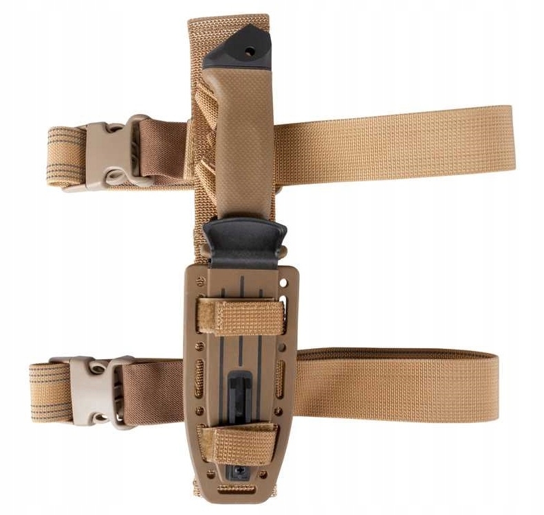 W zestawie z nożem znajduje się polimerowa pochwa. Wykonano ją w standardzie MOLLE co pozwoli nam zamocować ją na elementach oporządzenia czy plecaku. Dodatkowo wyposażono ją w taśmy montażowe co pozwoli przenosić nóż na udzie bądź łydce. Projektanci wyposażyli pochwę w bardzo ważny element wyposażenia survivalowego - ostrzałkę. Stanowi ona integralną część pochwy. W komplecie kabura udowa.
