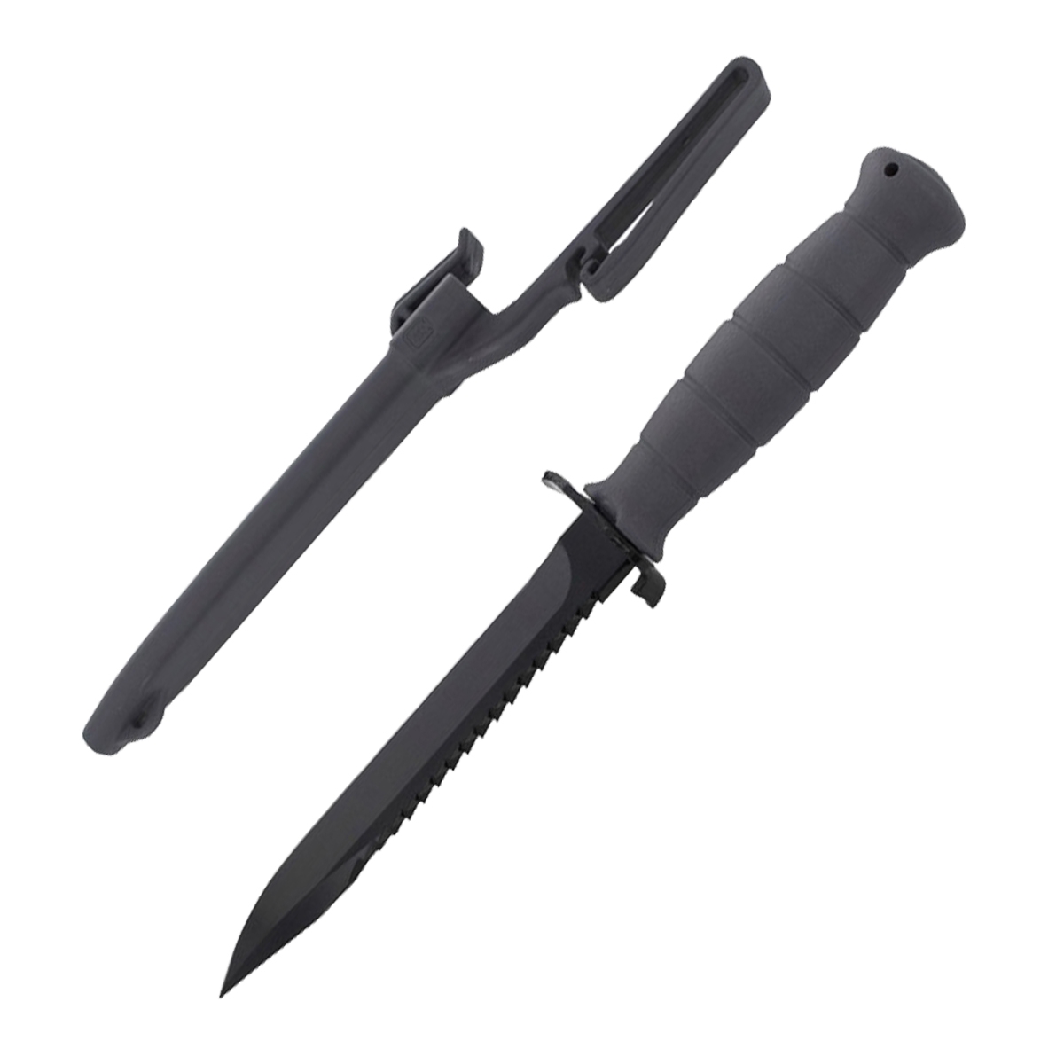 Rękojeść noża została wykonana z tego samego polimeru którego używa się do produkcji pistoletów Glock. Przed zsunięciem się dłoni na ostrze chroni stalowy jelec, którego kształt w górnej części pozwala na używanie go jako otwieracza do kapsli. Polimerowa pochewka w kolorze beżowym, posiada bardzo solidny zatrzask, który zabezpiecza nóż przed niekontrolowanym wysunięciem się z niej. Mocowana jest do paska za pomocą 60 mm szlufki.