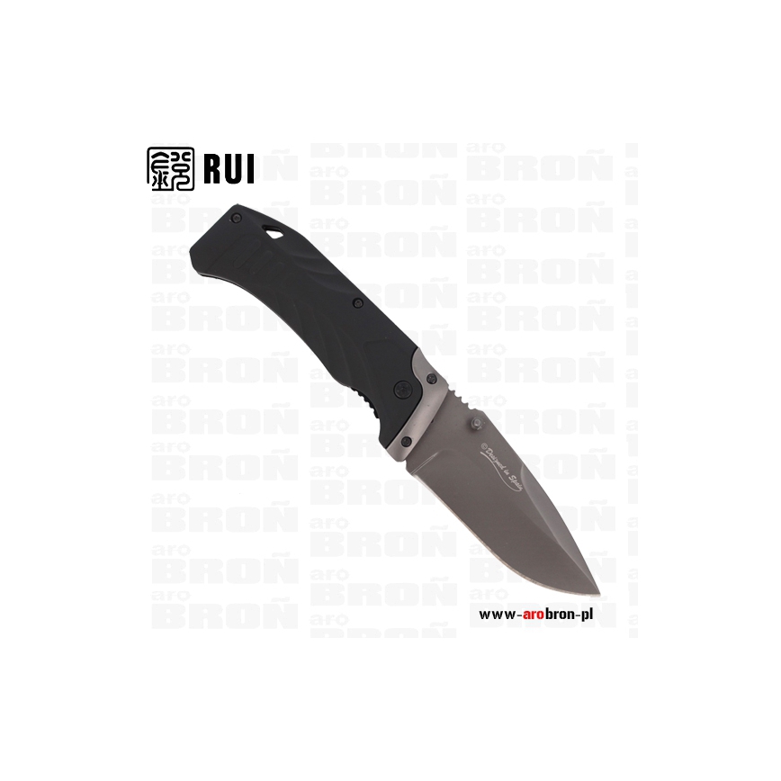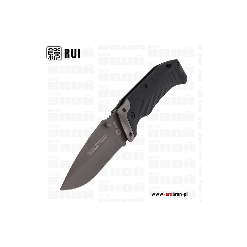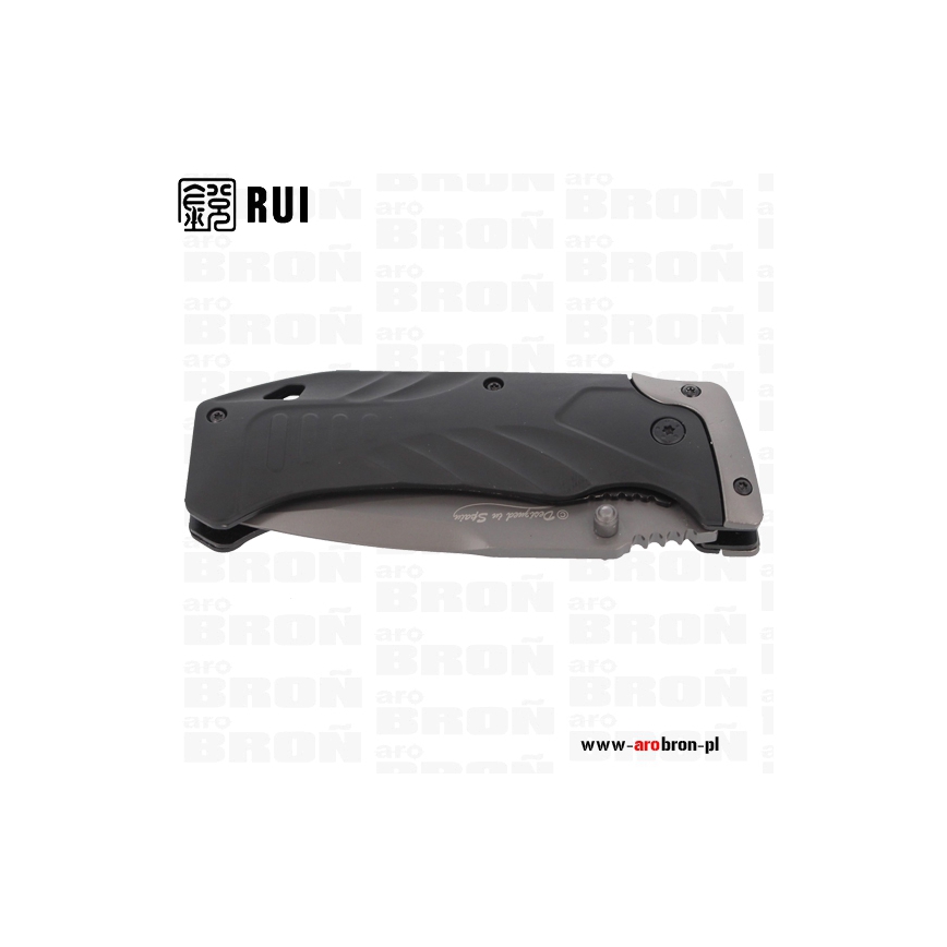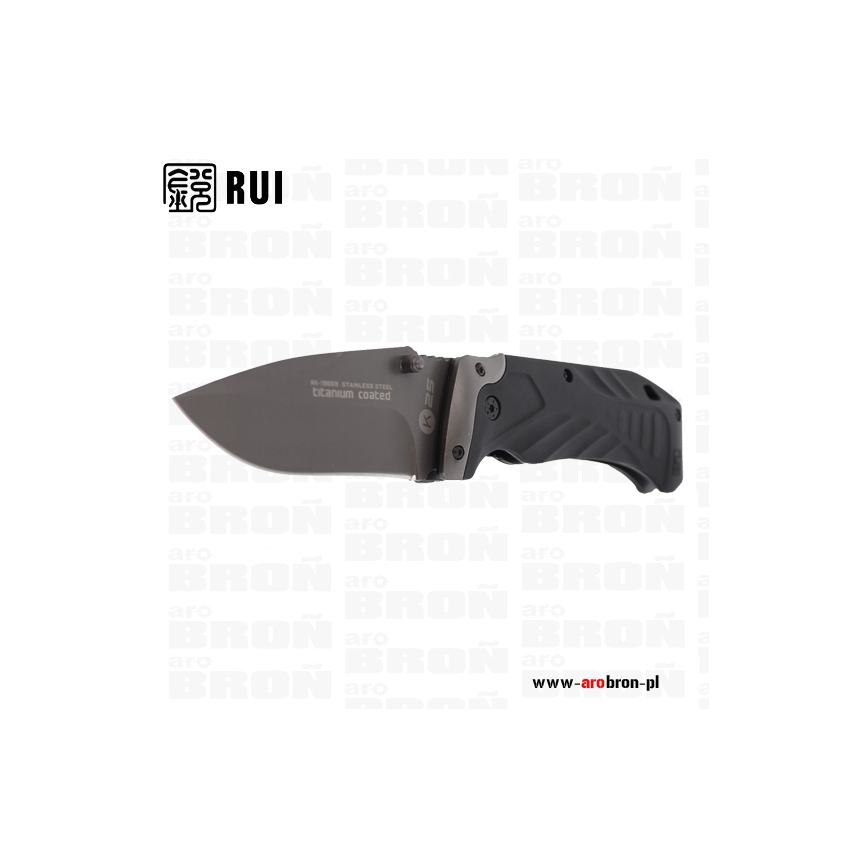 RUI K25 19669 to składany taktyczny nóż przeznaczony do użytku codziennego. Dzięki solidnej konstrukcji bardzo dobrze sprawdzi się na wyprawach i wędrówkach. Ostrze o profilu drop point zostało wykonane ze stali nierdzewnej 440 pokrytej tytanową powłoką. Nóż otwiera się za pomocą obustronnego kołka. Rękojeść posiada okładziny z włókna syntetycznego SFL pokrytego laminatem z naturalnej gumy. Zapewnia to pewny chwyt w każdych warunkach. Precyzyjne operowaniem nożem ułatwia karbowana rampa umieszczona na górze głowni. Bezpieczeństwo użytkowania zapewnia blokada liner lock. Na końcu rękojeści znajduje się otwór na zamocowania linki chroniącej przed zgubieniem noża. W komplecie znajduje się mocowana do pasa kabura z wodoodpornego nylonu zapinana klamrą DuraFlex.