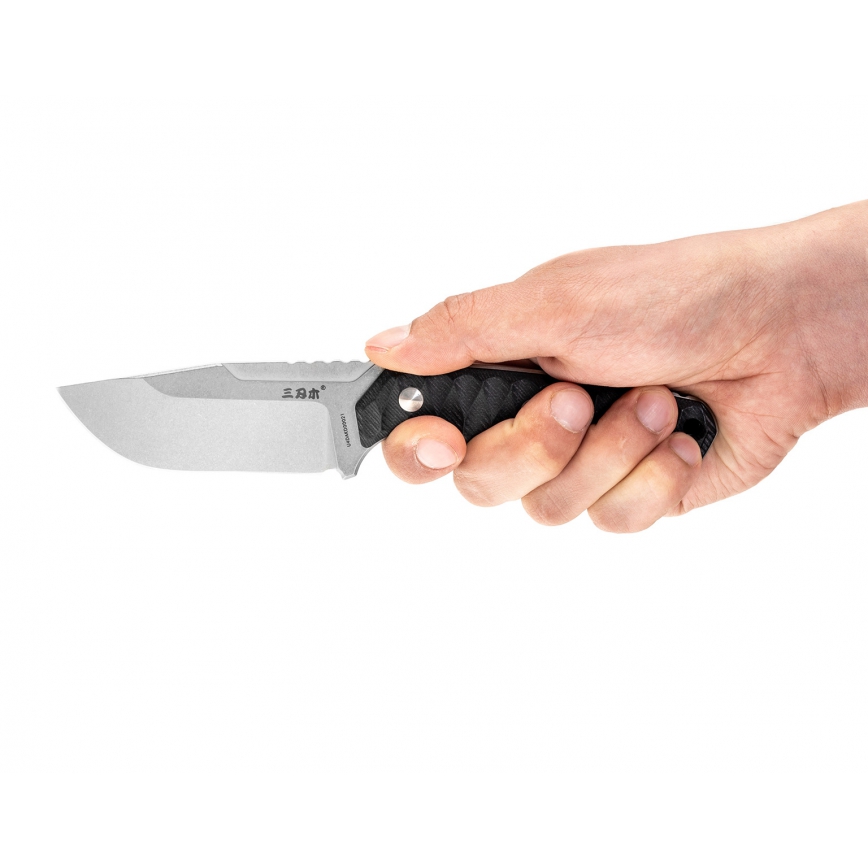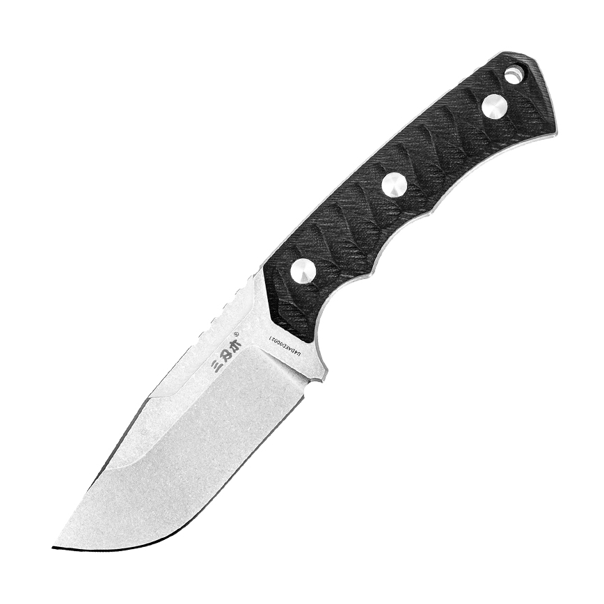 Nóż stały Sanrenmu S738 Black o konstrukcji full tang przeznaczony do użytku codziennego. Ostrze o profilu clip point zostało wykonane ze stali nierdzewnej 8Cr13MoV i wykończone metodą stonewashed. Na grzbiecie głowni znajduje się karbowane oparcie na kciuk zapewniające pewne operowanie nożem. Okładziny z laminatu G10 zostały przytwierdzone do rękojeści śrubami. Antypoślizgowe ryflowania zapewniają pewny chwyt. Na końcu ergonomicznej rękojeści znajduje się otwór do przewleczenia linki zabezpieczającej przed zgubieniem. W komplecie z nożem znajduje się kabura z kydexu.