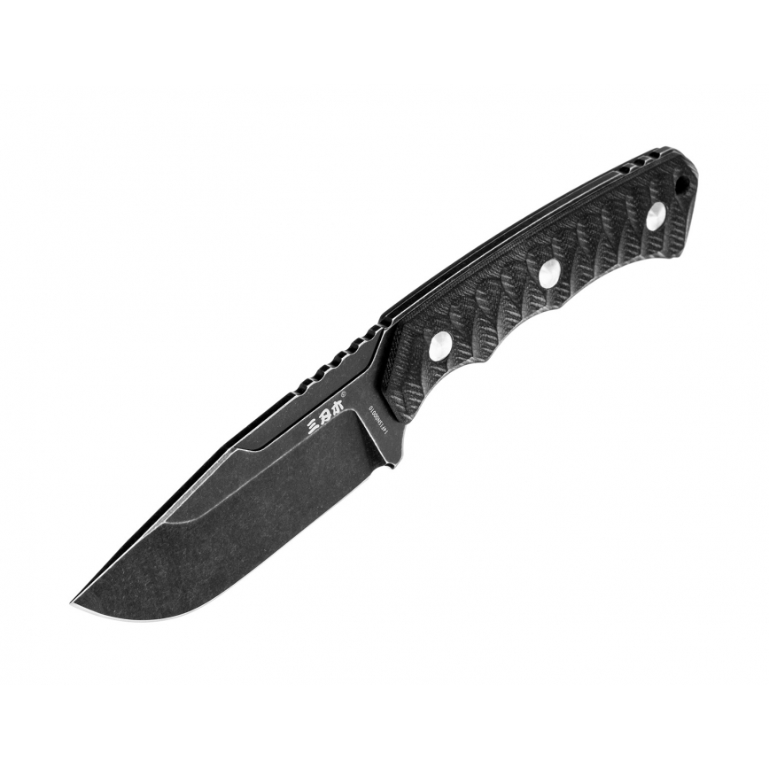 Nóż stały Sanrenmu S738 Blackwash o konstrukcji full tang przeznaczony do użytku codziennego. Ostrze o profilu clip point zostało wykonane ze stali nierdzewnej 8Cr13MoV i wykończone metodą blackwash. Na grzbiecie głowni znajduje się karbowane oparcie na kciuk zapewniające pewne operowanie nożem. Okładziny z laminatu G10 zostały przytwierdzone do rękojeści śrubami. Antypoślizgowe ryflowania zapewniają pewny chwyt. Na końcu ergonomicznej rękojeści znajduje się otwór do przewleczenia linki zabezpieczającej przed zgubieniem. W komplecie z nożem znajduje się kabura z kydexu.