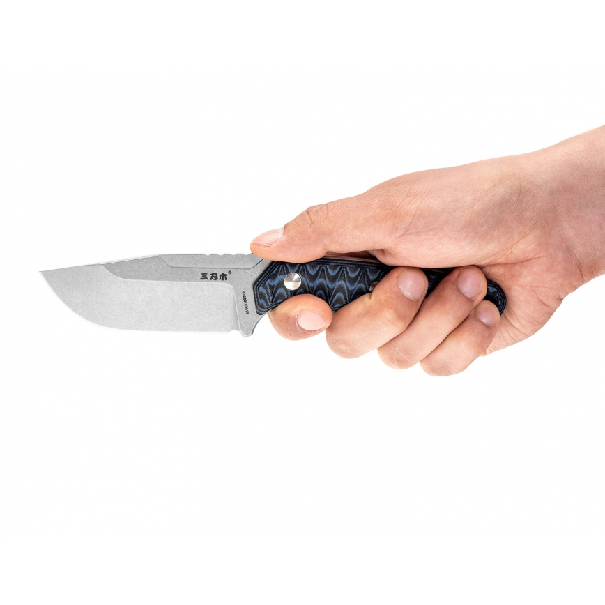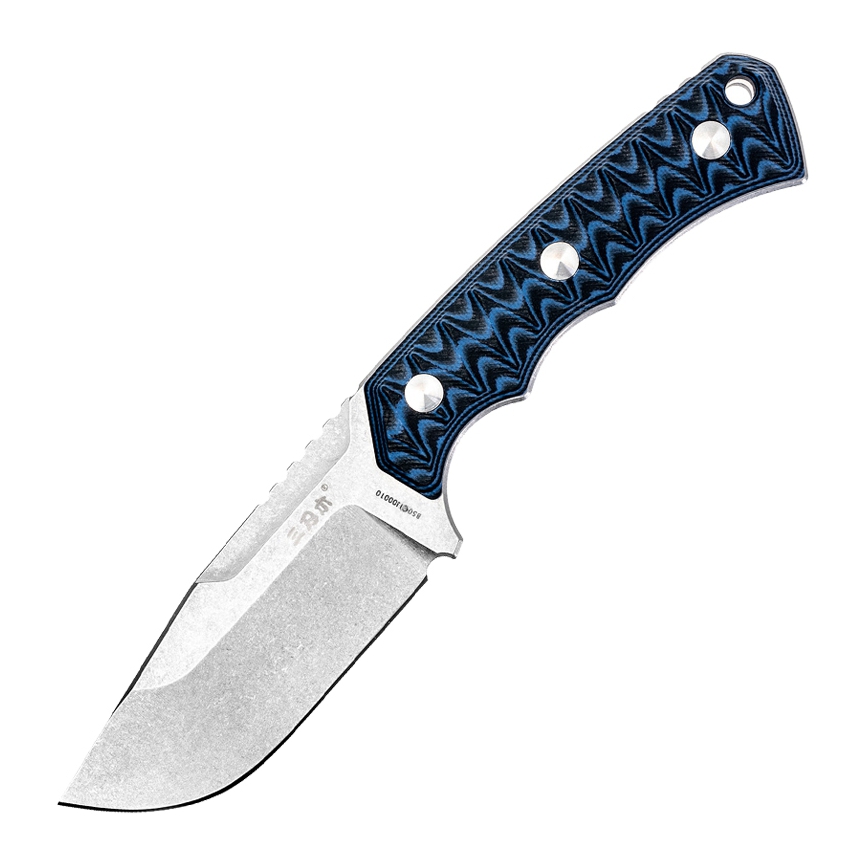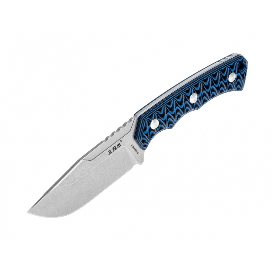 Nóż stały Sanrenmu S738 Blue o konstrukcji full tang przeznaczony do użytku codziennego. Ostrze o profilu clip point zostało wykonane ze stali nierdzewnej 8Cr13MoV i wykończone metodą stonewashed. Na grzbiecie głowni znajduje się karbowane oparcie na kciuk zapewniające pewne operowanie nożem. Okładziny z laminatu G10 zostały przytwierdzone do rękojeści śrubami. Antypoślizgowe ryflowania zapewniają pewny chwyt. Na końcu ergonomicznej rękojeści znajduje się otwór do przewleczenia linki zabezpieczającej przed zgubieniem. W komplecie z nożem znajduje się kabura z kydexu.