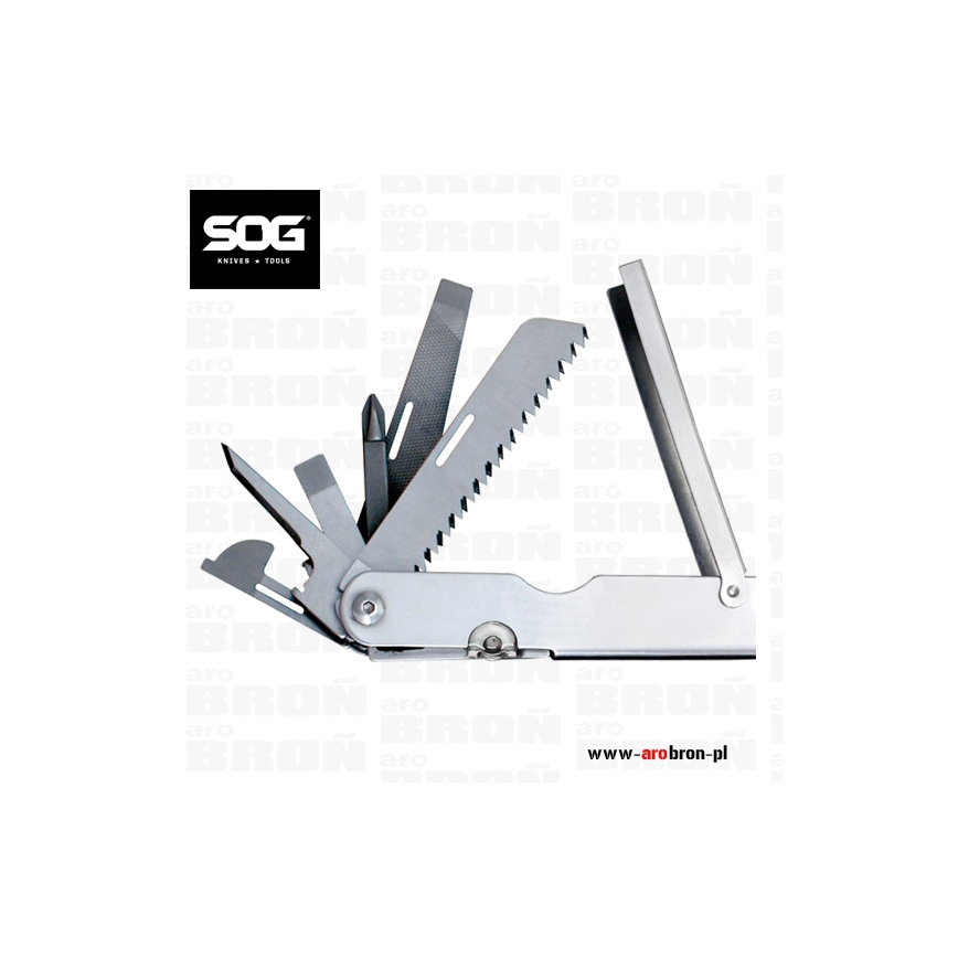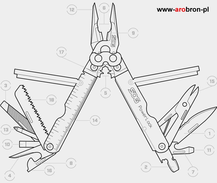 Multitool SOG PowerLock Nylon Sheath - to wielofunkcyjne narzędzie renomowanej amerykańskiej firmy SOG. Multitool posiada aż 18 narzędzi, które zadowolą każdego majsterkowicza. Cechą wyróżniająca multitoole SOG jest umiejscowienie zaciskacza do przewodów w rękojeści, a nie w kombinerkach. Całość wykonana została z wytrzymałej, hartowanej stali nierdzewnej 420. Firma Sog posiada opatentowaną technologię wspomagania otwierania toola SOG Assisted Technology™, która pozwala nam na łatwe otwieranie toola jedną ręką. Dodatkowo opatentowana została kontrukcja wzmacniająca nacisk kombinerek - Compound Leverage™. Dla bezpieczeństwa multitool posiada blokadę narzędzi.