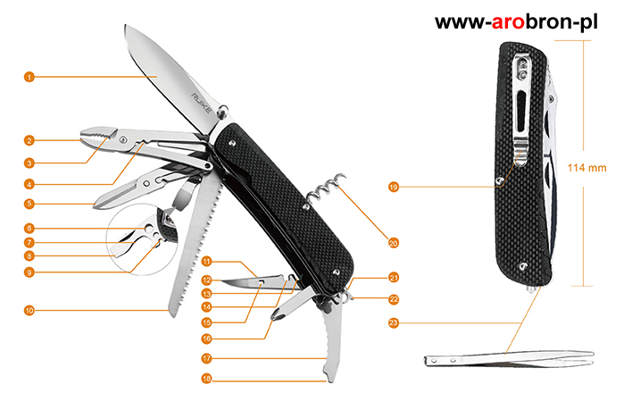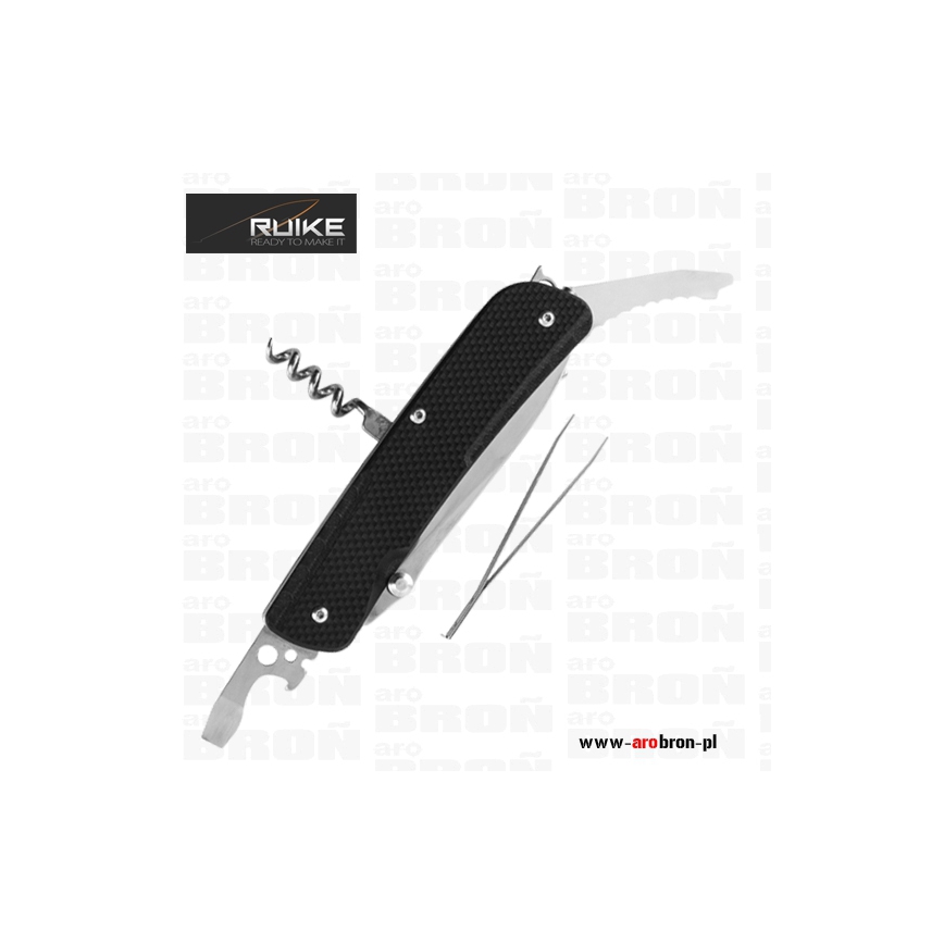 Scyzoryk Ruike LD51-B - to scyzoryk posiadający 23 przydatne funkcje, który sprawdzi się podczas wycieczek, ale również jako narzędzie użytku codziennego. Okładzina scyzoryka wykonana została z wytrzymałego kompozytu G10 o antypoślizgowej fakturze w kolorze czarnym. Ostrze oraz narzędzia wykonano z trwałej i łatwej do naostrzenia stali Sandvik 12C27 (58-59) HRC. Scyzoryk posiada blokadę głównego ostrza typu Liner Lock, dzięki której nóż nie złoży się podczas użytkowania. Scyzoryk posiada stalowy klips, dzięki któremu łatwo zamontujemy scyzoryk np. o krawędź kieszeni, ale również key-ring, którym możemy zamocować scyzoryk do breloczka bądź kluczy.