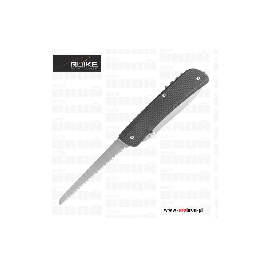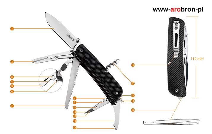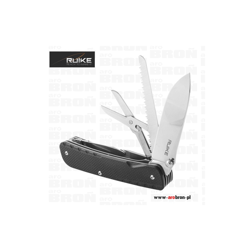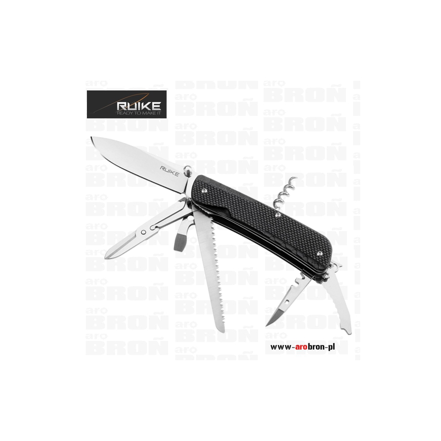 Scyzoryk Ruike LD42-B - to scyzoryk posiadający 19 przydatnych funkcji, który sprawdzi się podczas wycieczek, ale również jako narzędzie użytku codziennego. Okładzina scyzoryka wykonana została z wytrzymałego kompozytu G10 o antypoślizgowej fakturze w kolorze czarnym. Ostrze oraz narzędzia wykonano z trwałej i łatwej do naostrzenia stali Sandvik 12C27 (58-59) HRC. Scyzoryk posiada blokadę głównego ostrza typu Liner Lock, dzięki której nóż nie złoży się podczas użytkowania. Scyzoryk posiada stalowy klips, dzięki któremu łatwo zamontujemy scyzoryk np. o krawędź kieszeni, ale również key-ring, którym możemy zamocować scyzoryk do breloczka bądź kluczy.