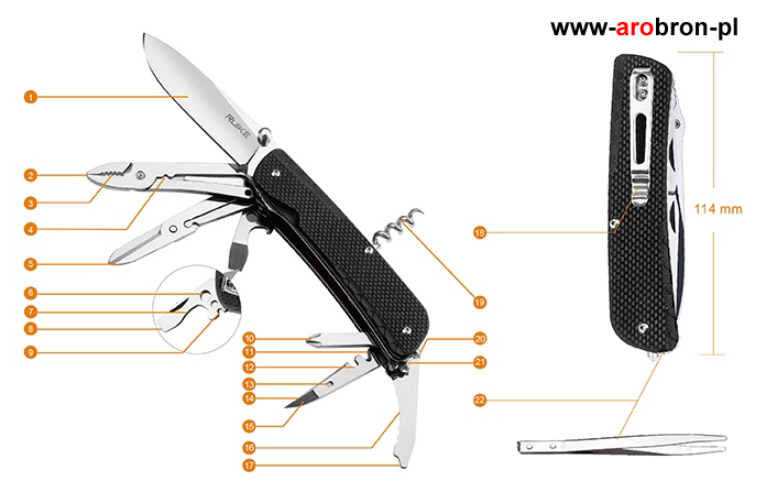 Scyzoryk Ruike LD41-B - to scyzoryk posiadający 22 przydatnych funkcji, który sprawdzi się podczas wycieczek, ale również jako narzędzie użytku codziennego. Okładzina scyzoryka wykonana została z wytrzymałego kompozytu G10 o antypoślizgowej fakturze w kolorze czarnym. Ostrze oraz narzędzia wykonano z trwałej i łatwej do naostrzenia stali Sandvik 12C27 (58-59) HRC. Scyzoryk posiada blokadę głównego ostrza typu Liner Lock, dzięki której nóż nie złoży się podczas użytkowania. Scyzoryk posiada stalowy klips, dzięki któremu łatwo zamontujemy scyzoryk np. o krawędź kieszeni, ale również key-ring, którym możemy zamocować scyzoryk do breloczka bądź kluczy.
