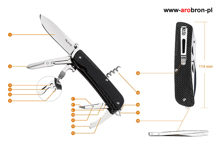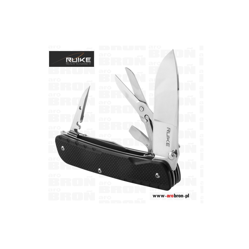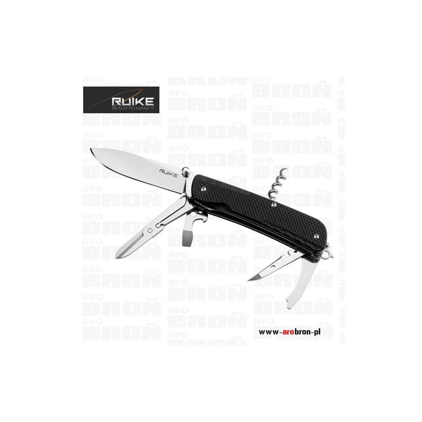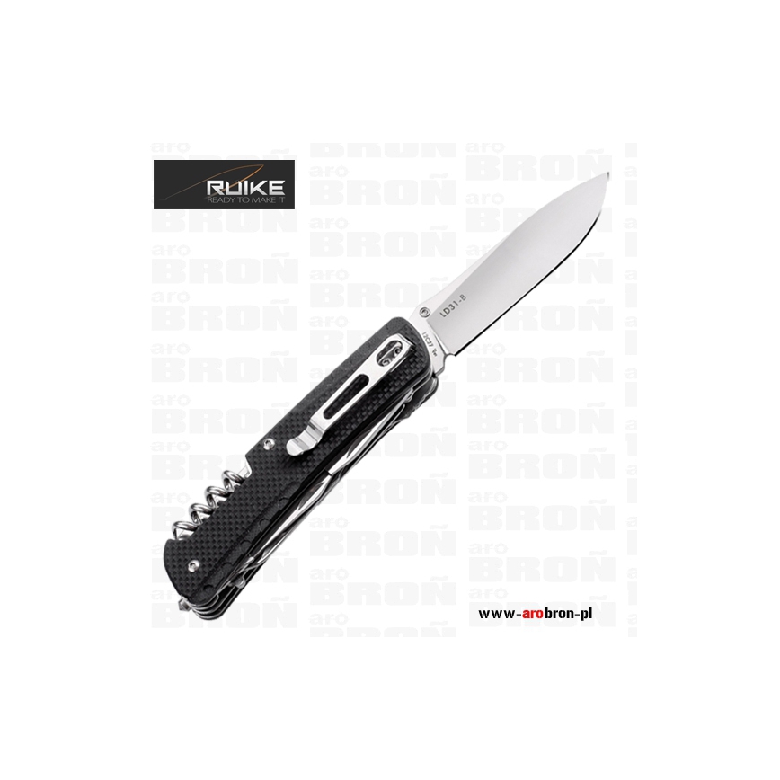 Scyzoryk Ruike LD31-B - to scyzoryk posiadający 18 przydatnych funkcji, który sprawdzi się podczas wycieczek, ale również jako narzędzie użytku codziennego. Okładzina scyzoryka wykonana została z wytrzymałego kompozytu G10 o antypoślizgowej fakturze w kolorze czarnym. Ostrze oraz narzędzia wykonano z trwałej i łatwej do naostrzenia stali Sandvik 12C27 (58-59) HRC. Scyzoryk posiada blokadę głównego ostrza typu Liner Lock, dzięki której nóż nie złoży się podczas użytkowania. Scyzoryk posiada stalowy klips, dzięki któremu łatwo zamontujemy scyzoryk np. o krawędź kieszeni, ale również key-ring, którym możemy zamocować scyzoryk do breloczka bądź kluczy.