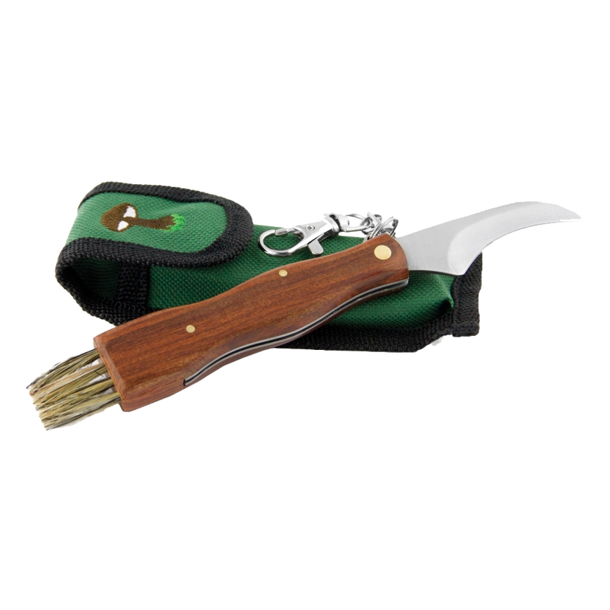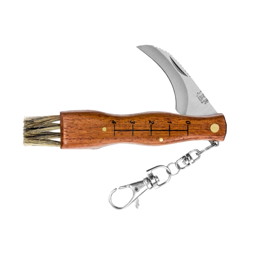 Nóż składanyznanej firmy Joker. Przeznaczony do zbierania grzybów z drewnianą rękojeścią. Ostrze Warncliff. Na rękojeści znajduje się miarka średnicy grzyba. Na końcu „miotełką” służaca od oczyszczania brudnych grzybów.Dane techniczne: