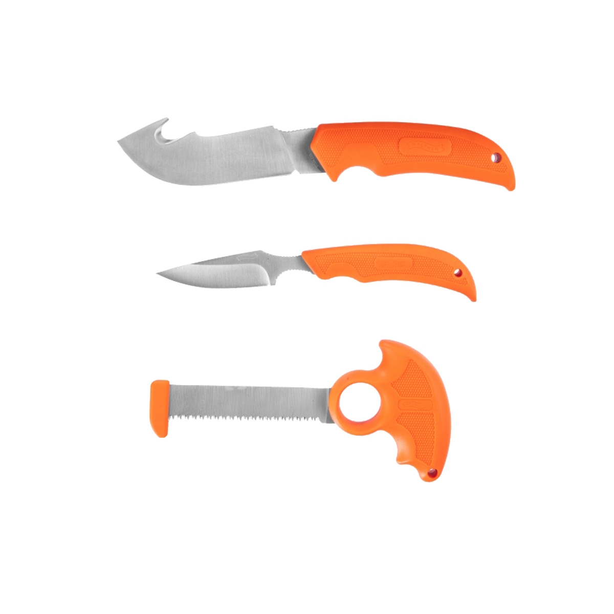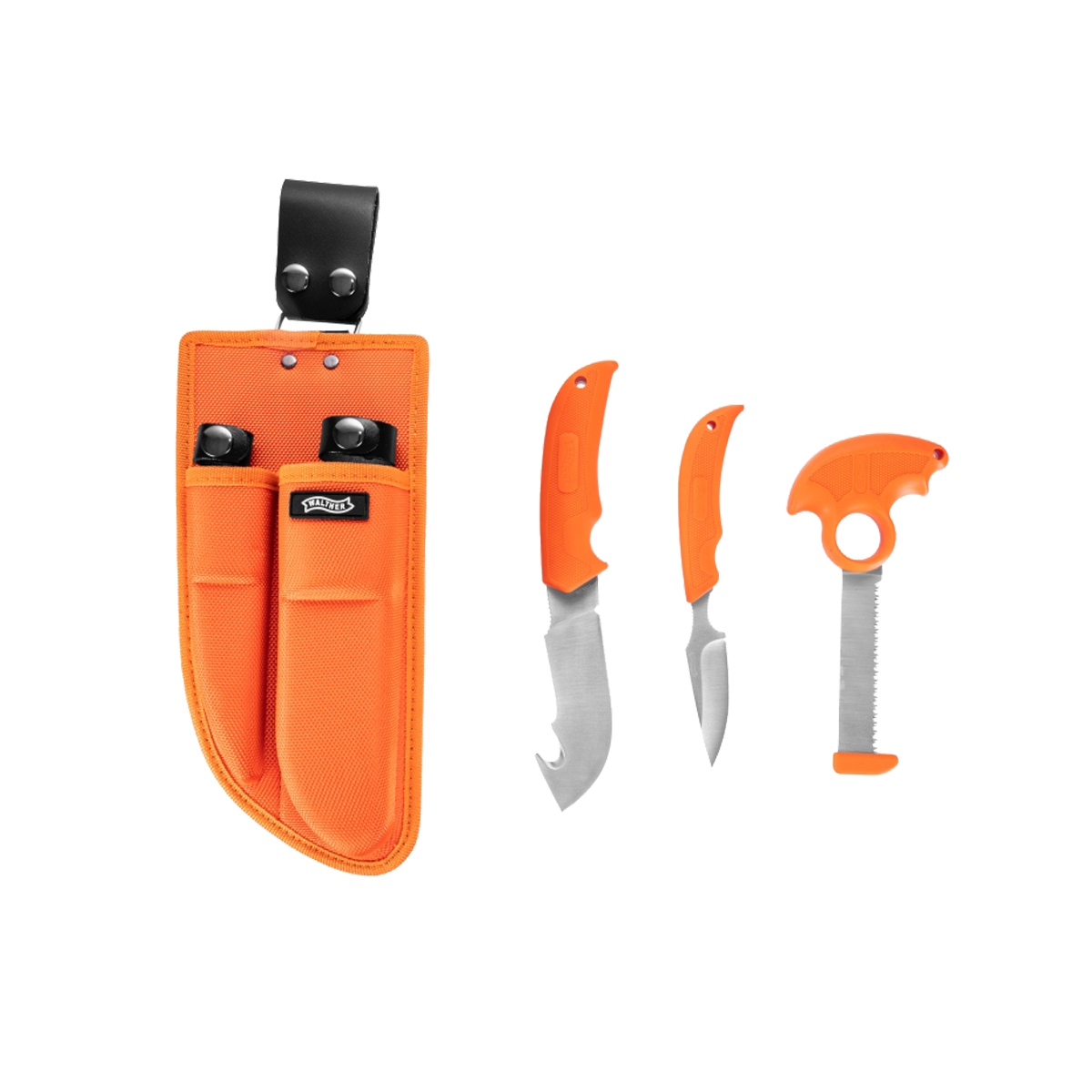 WALTHER HUNTER SET to zestaw 3 przydatnych do obrabiania zwierzyny narzędzi. W jego skład wchodzą mały nóż do patroszenia, nóż myśliwski z hakiem tnącym do skórowania oraz piła do cięcia kości. Do transportu narzędzi otrzymujemy w zestawie wygodną kaburę, wykonaną z nylonu balistycznego, w której zmieści się cały zestaw.
