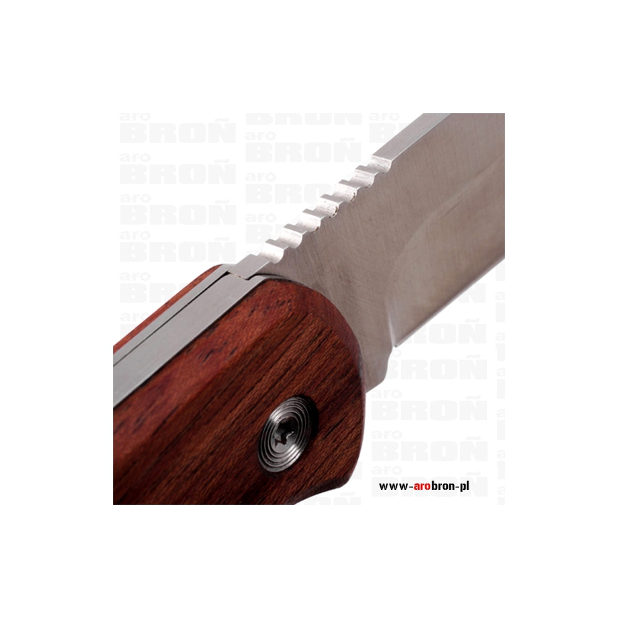 Nóż wykonano ze stali nierdzewnej Sandvik 12C27 o twardości 57-59 HRC, czyli idealnie dopasowanej do potrzeb myśliwych, a co najważniejsze łatwo się go ostrzy. Rękojeść wykonano z selekcjonowanego drewna Bubinga specjalnie profilowanego by pewnie i bezpiecznie nóż trzymał się w dłoni. Z czterech stron rękojeść skręcona jest śrubami na płaski śrubokręt, dzięki czemu łatwo i szybko można go rozkręcić do czyszczenia.