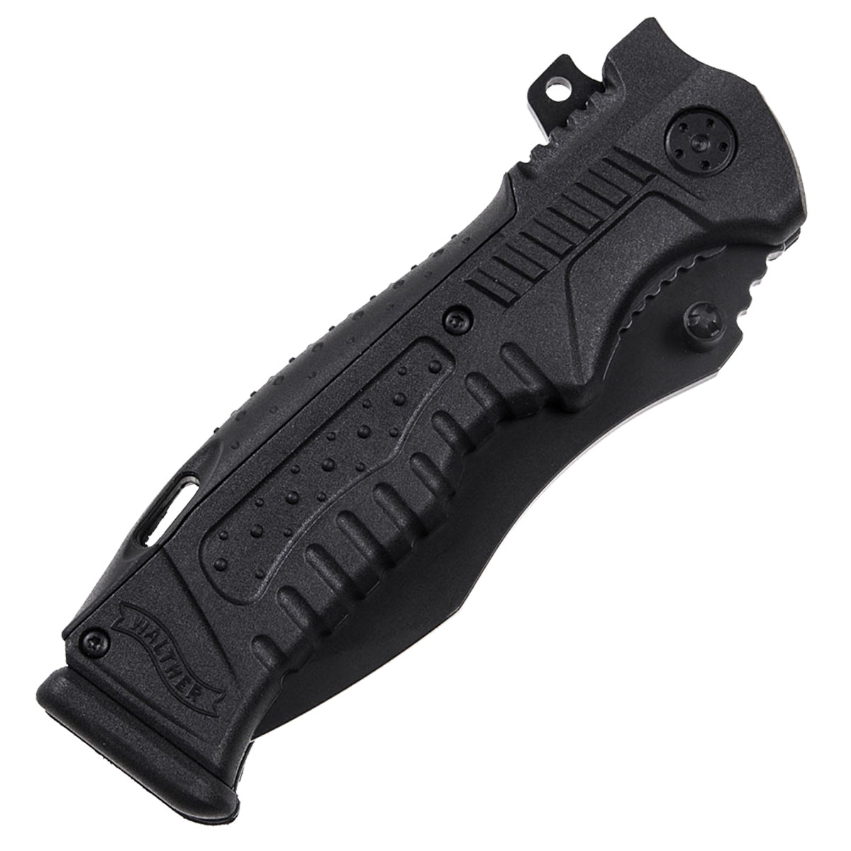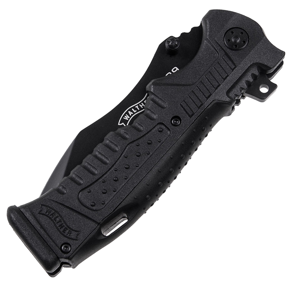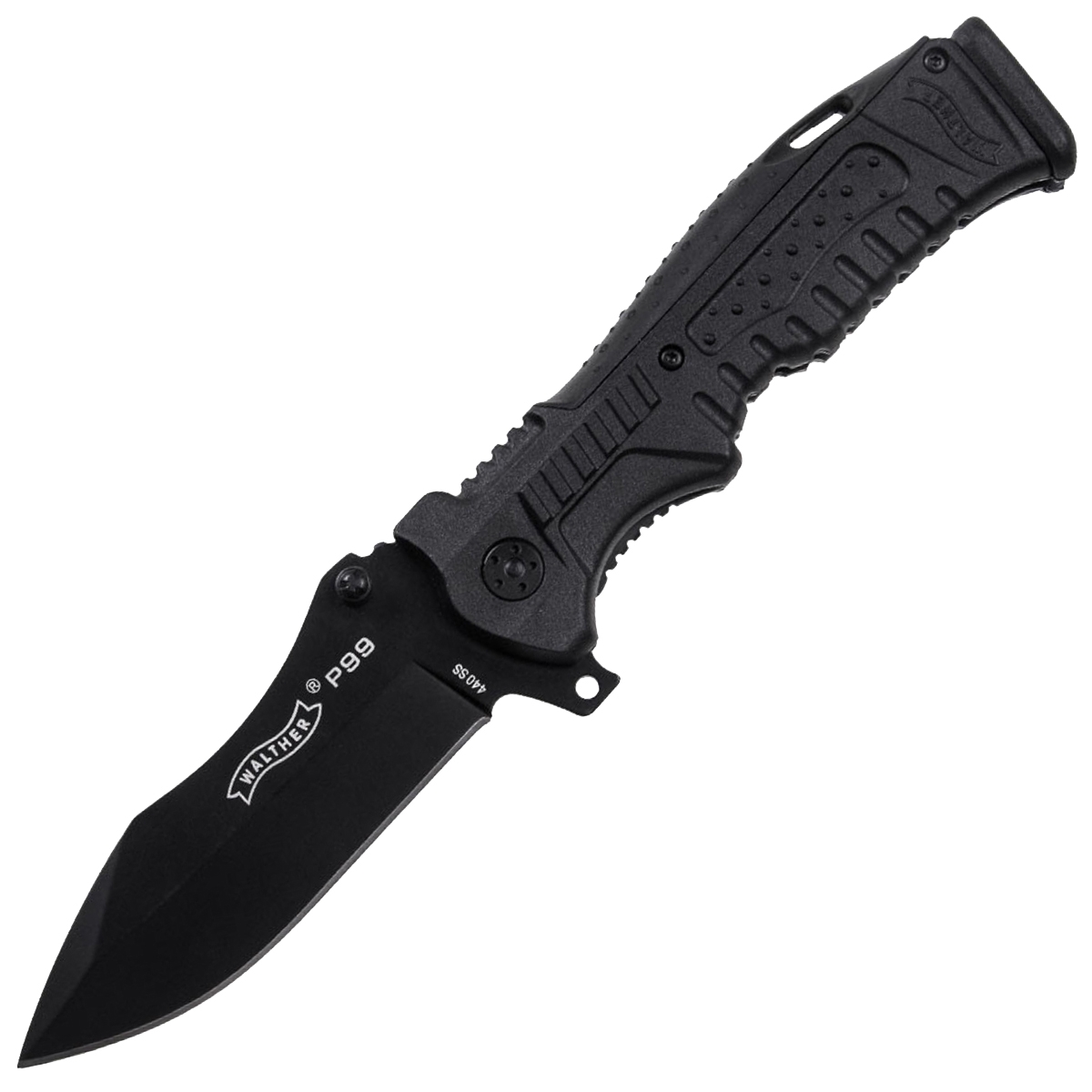 - Walther P99 to folder taktyczny, wyposażony w kołek oraz tzw. flipper czyli zaczep głowni pozwalający błyskawicznie rozłożyć ostrze na dwa sposoby.