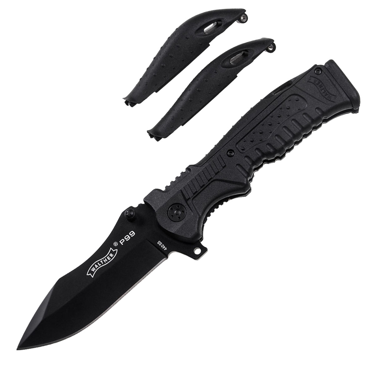 Walther P99 jest składanym nożem taktycznym, wyposażonym w kaburę z codury oraz zestaw wymiennych okładzin w 3 rozmiarach.