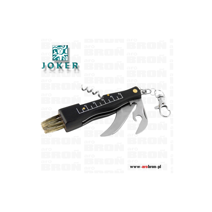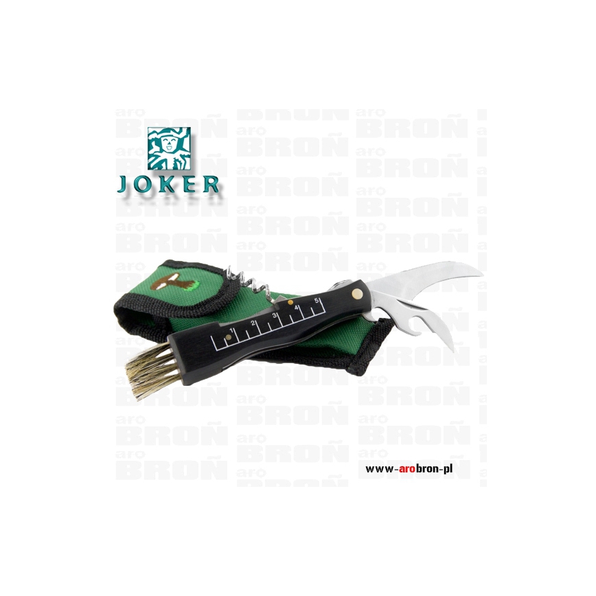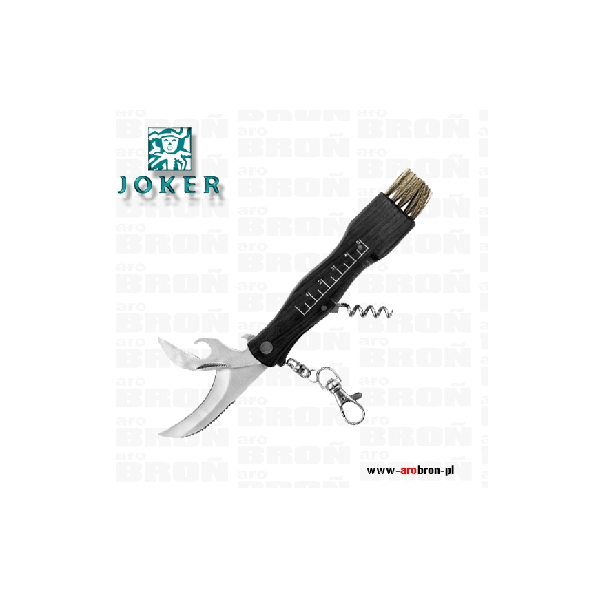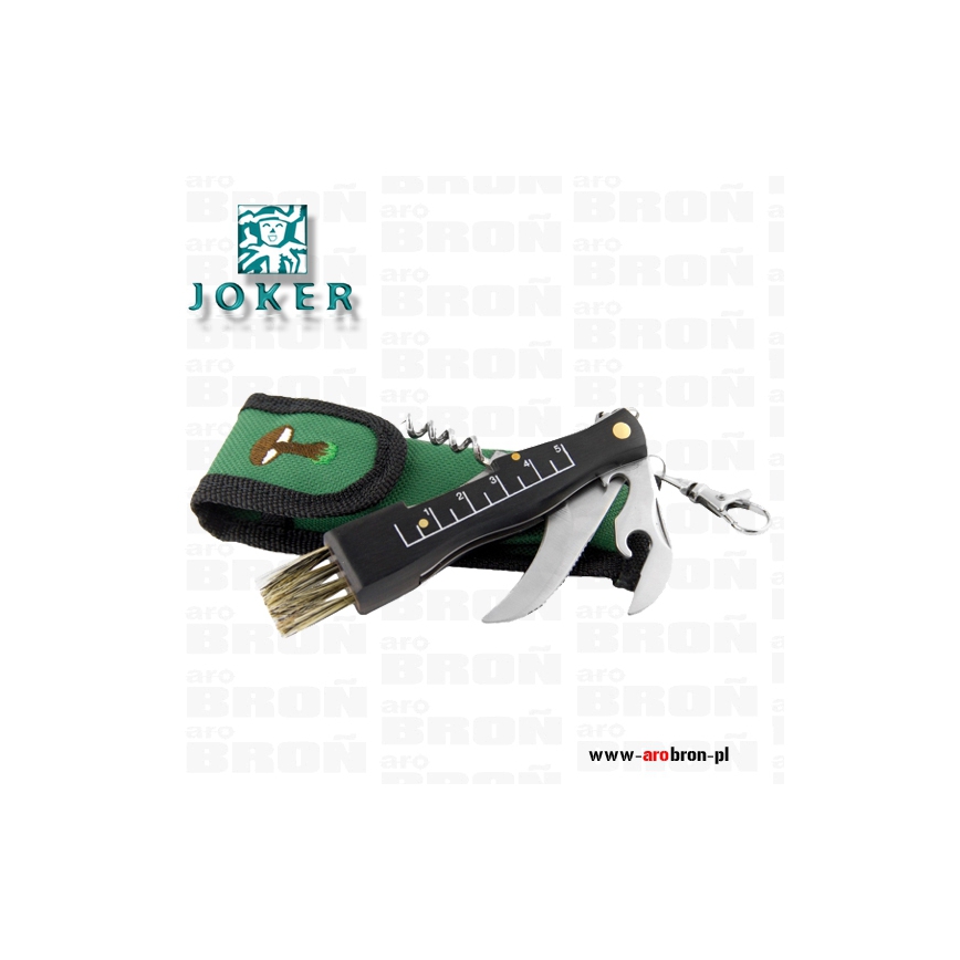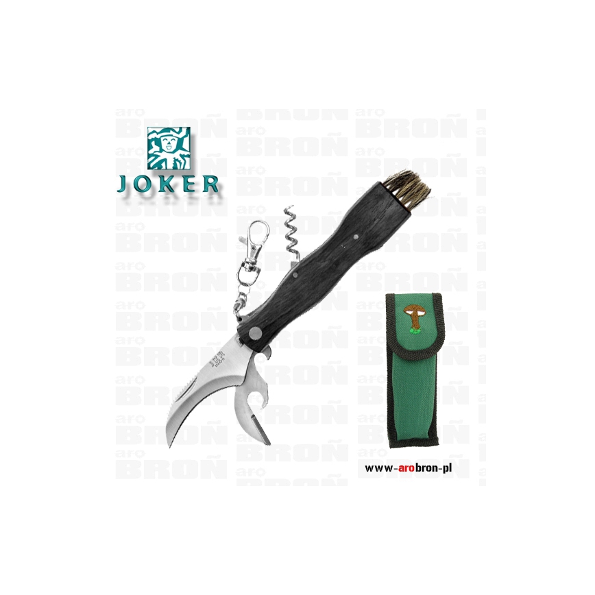 Nóż Joker składane JKR089 to profesjonalny nóż składany hiszpańskiego producenta JOKER. Skierowany został do zbieraczy grzybów. Ostrze ze stali nierdzewnej o wygiętym profilu warncliff ułatwia przycinanie grzybów. Dodatkowo na rękojeści znajduje się miarka umożliwiająca zmierzenie średnicy grzybów. Jako narzędzie wielofunkcyjne nóż posiada otwieracz do puszek i butelek, pensetę oraz korkociąg. Na końcu rękojeści wyposażonej w drewniane okładziny znajduje się miotełka do oczyszczenia grzybów z ziemi i piasku. Nóż został wyposażony w karabińczyk, który ułatwia przypięcie do pasa.