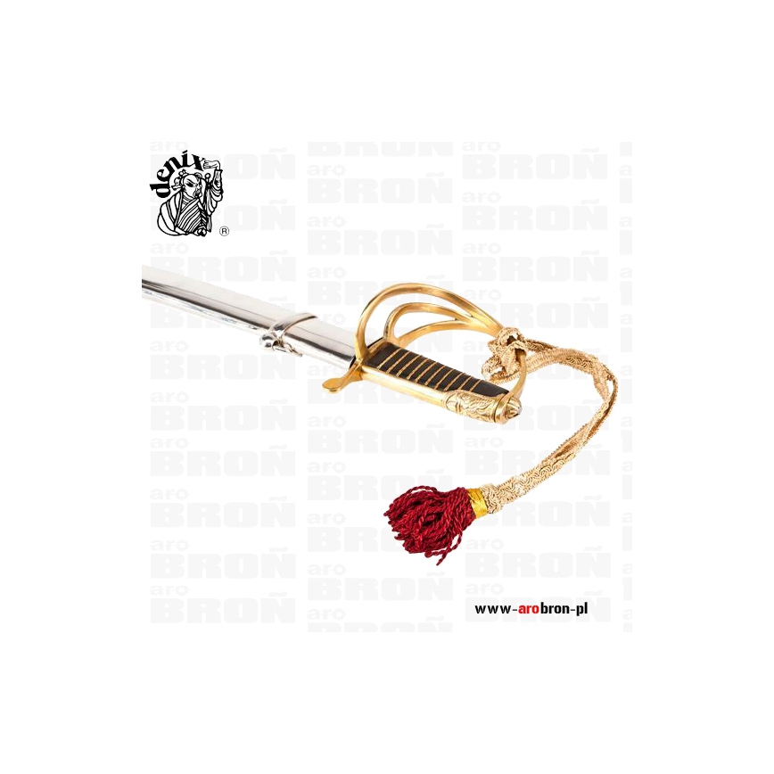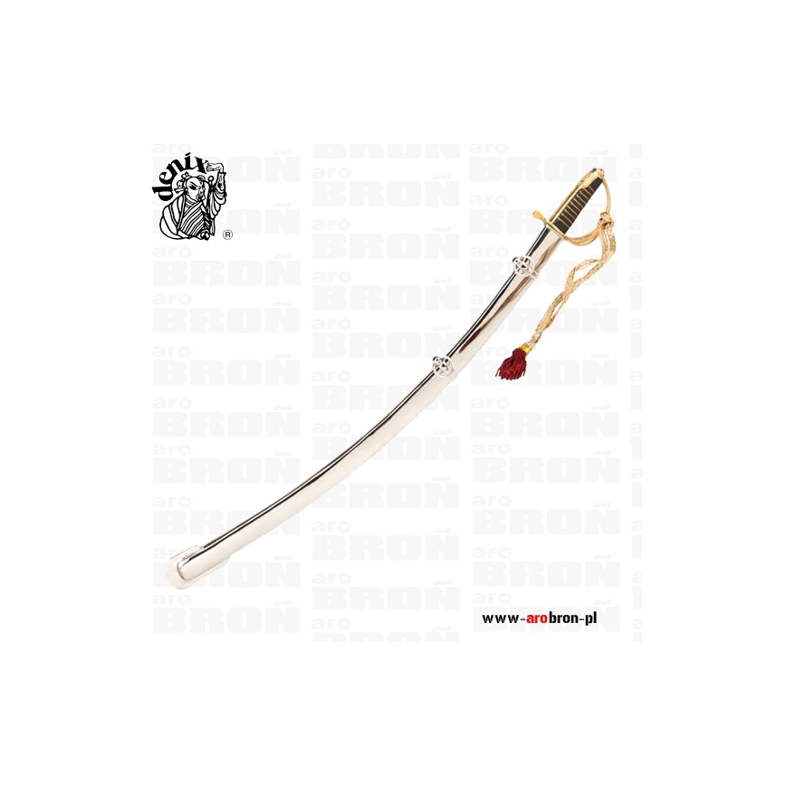 Szabla Polska Kawaleryjska Denix 1917 - replika szabli polskiej Kawalerii wykonana ręcznie przez polskiego producenta Denix z dbałością o każdy szczegół. Trzon rękojeści jest drewniany, obciągnięty czarną skórą. Karby wypełnione mosiężnym skręconym drutem tzw. kordelasem. Rękojeść zamknięta z mosiężnym jelcem trzykabłąkowym. Głownia ze stali wysokogatunkowej niehartowanej. Do rękojeści zamocowano ozdobny temblak ze złotej taśmy zakończonej czerwonym chwostem. Pochwa blaszana z dwoma ryfkami i ruchomymi koluszkami, zakończona ostrogą - płetwą.