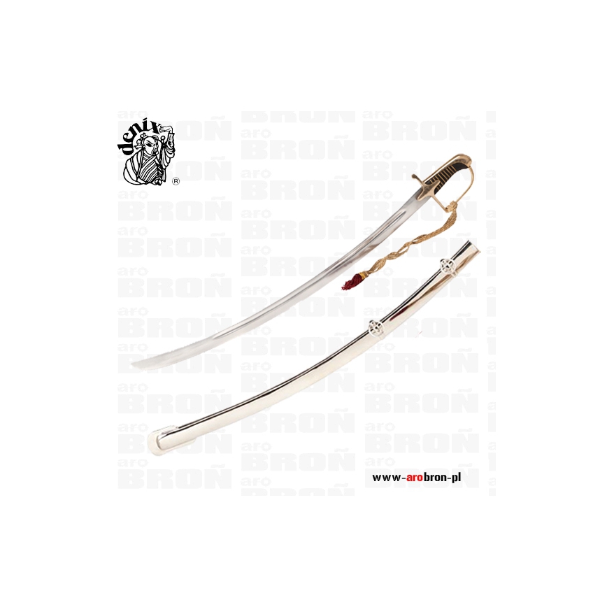 Szabla Polska Ułańska Denix 1921 - replika szabli polskiej oficerskiej wykonana ręcznie przez polskiego producenta Denix z dbałością o każdy szczegół. Trzon rękojeści jest drewniany, obciągnięty czarną skórą. Ostrze szabli czyli tzw. głownia wykonana została ze stali. Rękojeść z jelcem wykonana z mosiądzu. Jelec krzyżowo kabłąkowy. Rękojeść stylizowana na skórę jaszczura oraz opleciona ozdobnym drutem. Do rękojeści zamocowano ozdobny temblak ze złotej taśmy zakończonej czerwonym chwostem. Pochwa blaszana z dwoma ryfkami i ruchomymi koluszkami, zakończona ostrogą - płetwą.