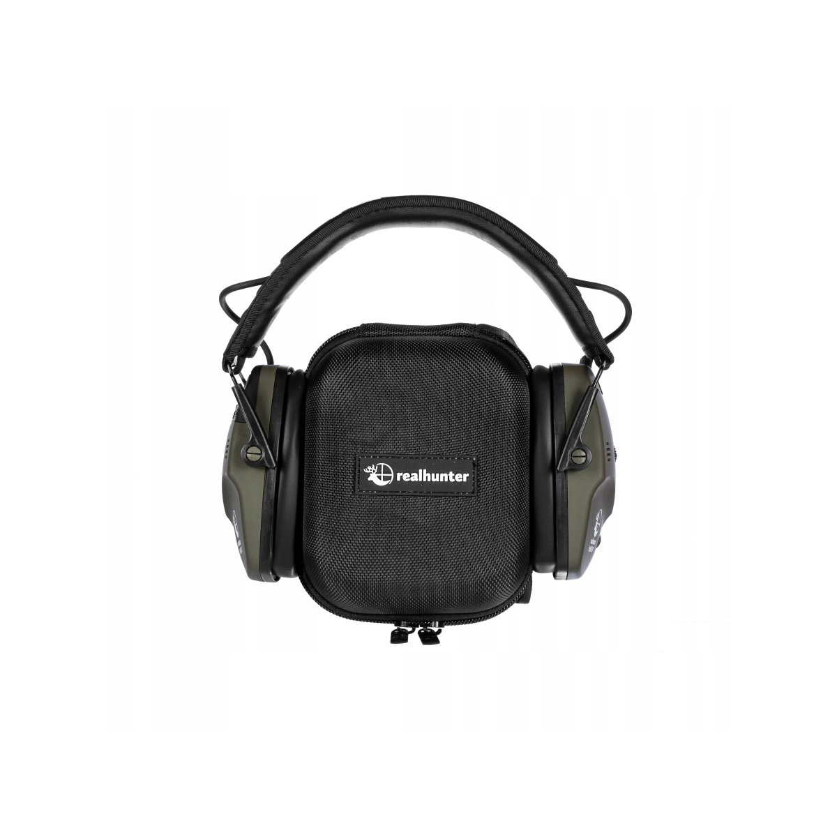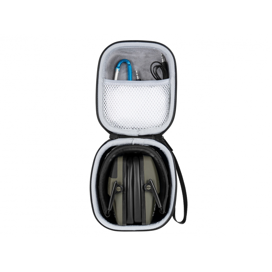 W zestawie z ochronnikami słuchu RealHunter ProShot BT znajduje się kabel minijack 3,5 mm, aluminiowy karabińczyk oraz sztywne etui, które zapewniają bezpieczeństwo podczas transportu.