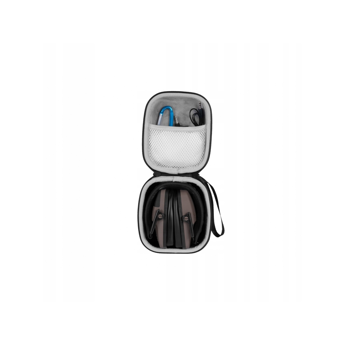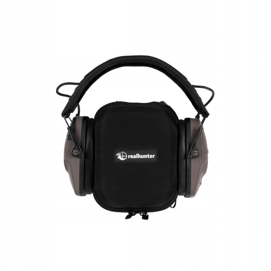 W zestawie z ochronnikami słuchu RealHunter ProShot BT znajduje się kabel minijack 3,5 mm, aluminiowy karabińczyk oraz sztywne etui, które zapewniają bezpieczeństwo podczas transportu.