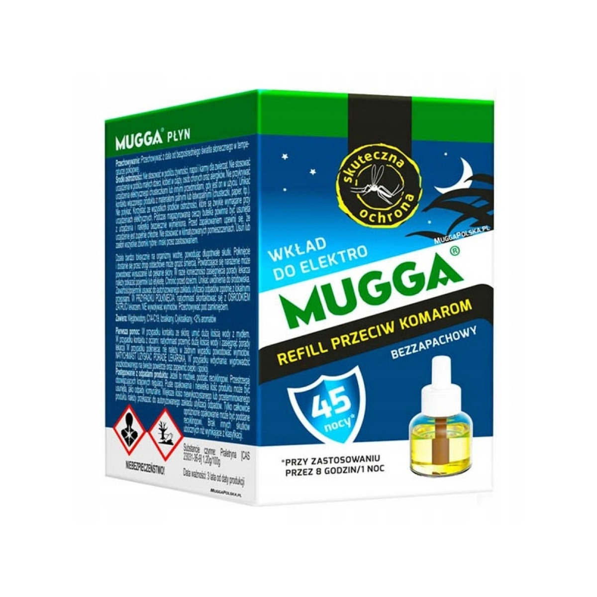 Wkład do elektrofumigatora Mugga 45 nocy 35ml - wkład do urządzenia instalowanego w standardowym gniazdku sieciowym 230 V - dzięki temu w przeciwieństwie do preparatów w postaci świec nie wymaga zapłonu, a co za tym idzie, nie generuje nieprzyjemnie pachnącego dymu. Urządzenie powinno być wykorzystywane przez nie więcej niż 8 godzin, aby zagwarantować, że obecne w powietrzu stężenie preparatu nie będzie miało żadnego wpływu na nasze zdrowie.