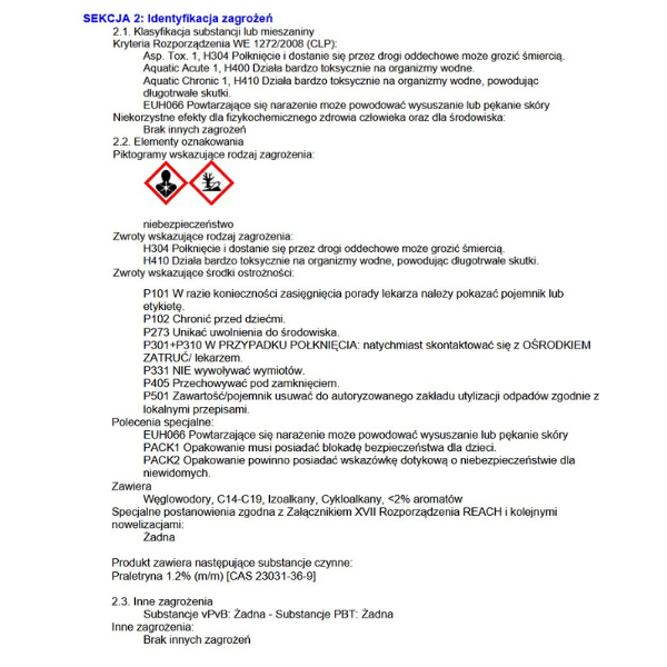 - Skład: praletryna 1,20g/100g, węglowodory, C14-C19, izoalkany, cykloalkany, <2% aromatów