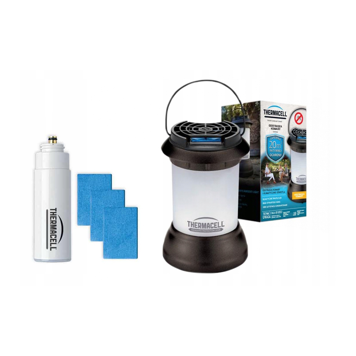 W zestawie: Odstraszacz Thermacell Bristol + kartridż z butanem (wystarcza na 12 godzin pracy urządzenia) + 3 oryginalne maty (każda starczy na 4 godziny pracy).