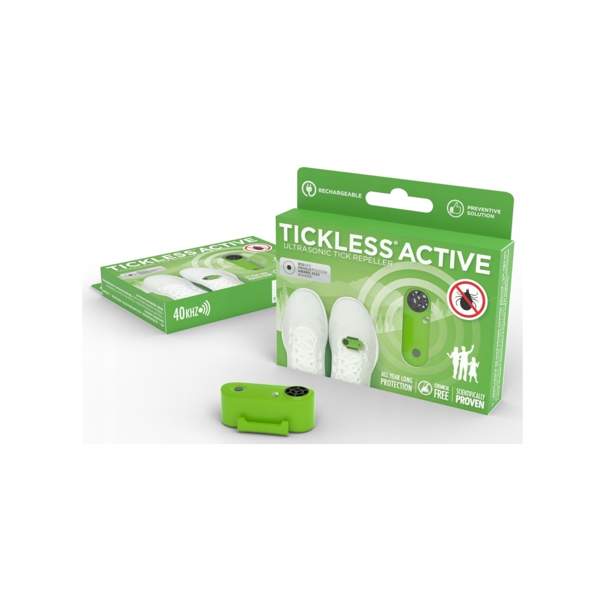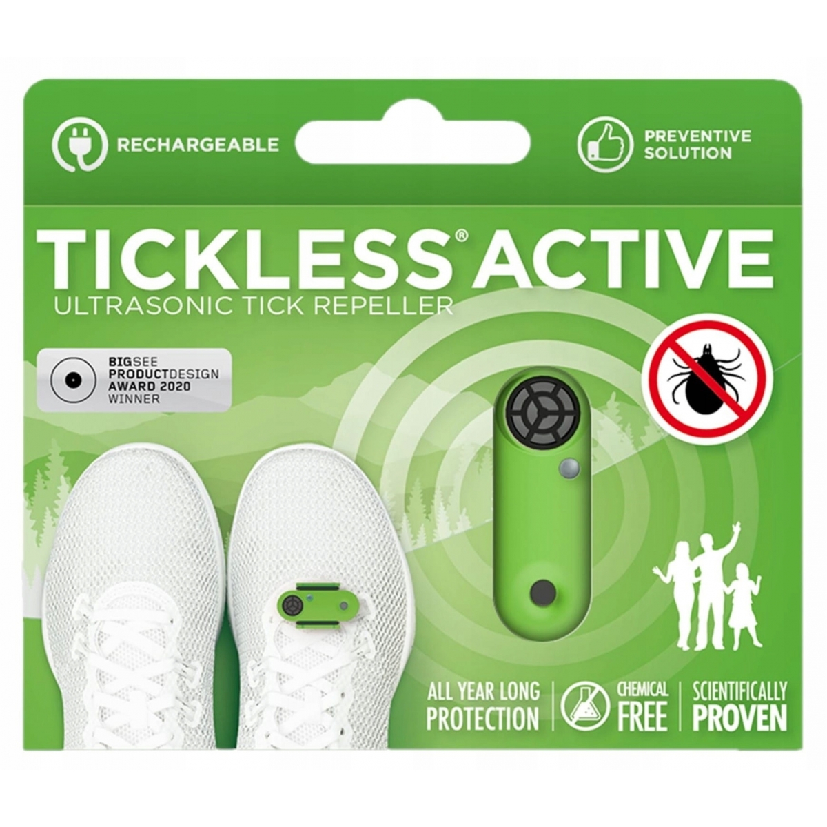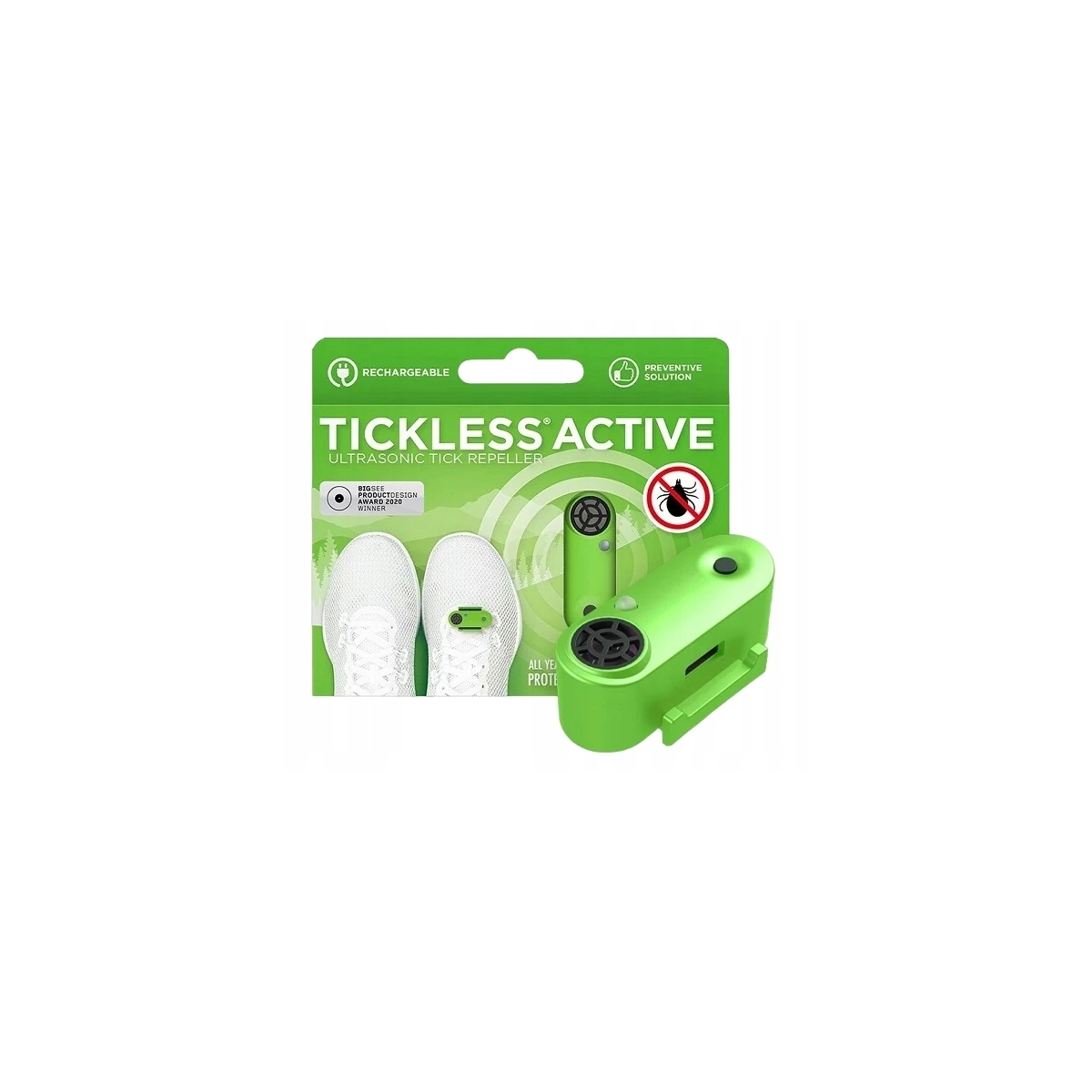 Odstraszacz kleszczy ultradźwiękowy TICKLESS Active Green AC01GR - to nowoczesne rozwiązanie do odstraszania kleszczy dla osób aktywnie spędzających czas. Certyfikowany odstraszacz na kleszcze opracowany i wyprodukowany we Włoszech. Te małych rozmiarów urządzenie działa na zasadzie emisji ultradźwięków o zmiennej częstotliwości, które nie są szkodliwe ani uciążliwe dla ludzi i zwierząt domowych. Działają natomiast odstraszająco na kleszcze i trzymają je z dala od nas.