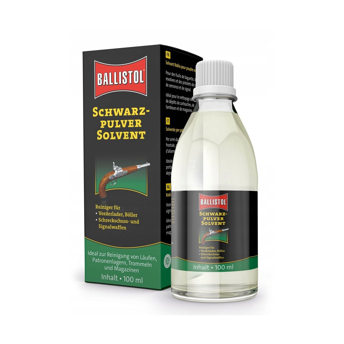 Płyn do suwania prochu Ballistol - rozpuszczalnik czarnego prochu rozluźnia i usuwa pozostałości prochu, takie jak sadza, sole nieorganiczne i kwaśne pozostałości po spalaniu. Usuwa również cząsteczki oleju i węgla przylegające do metalu. Jest szczególnie polecany do czyszczenia luf, systemów wyrzutu nabojów w rewolwerach oraz podajników nabojów w pistoletach, które są bardzo wrażliwe na pozostałości prochu.