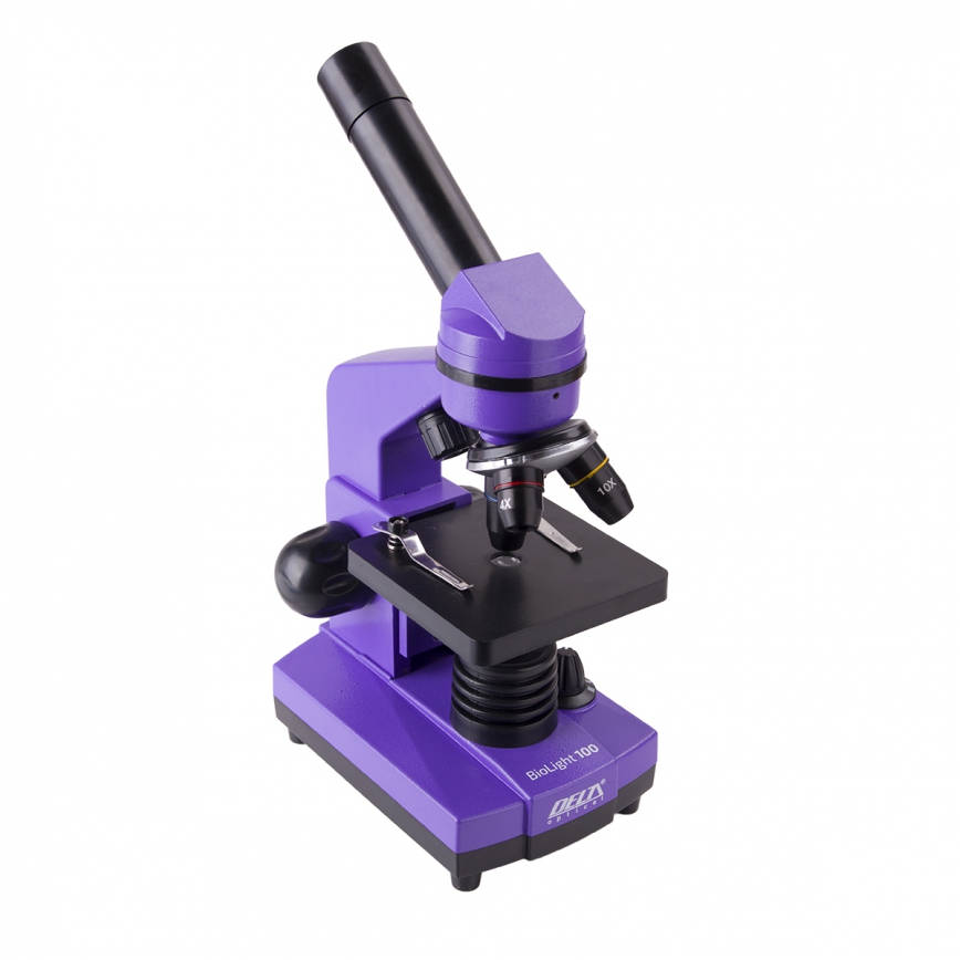 Mikroskop Delta Optical BioLight 100 Fioletowy - to edukacyjny, funkcjonalny mikroskop zaprojektowany dla początkujących użytkowników. Świetnie nadaje się jako prezent na komunię, gdyż jest łatwy w obsłudze i wystarczający do podstawowych obserwacji komórek i tkanek roślin oraz zwierząt, pierwotniaków i planktonicznych skorupiaków w kropli wody.
