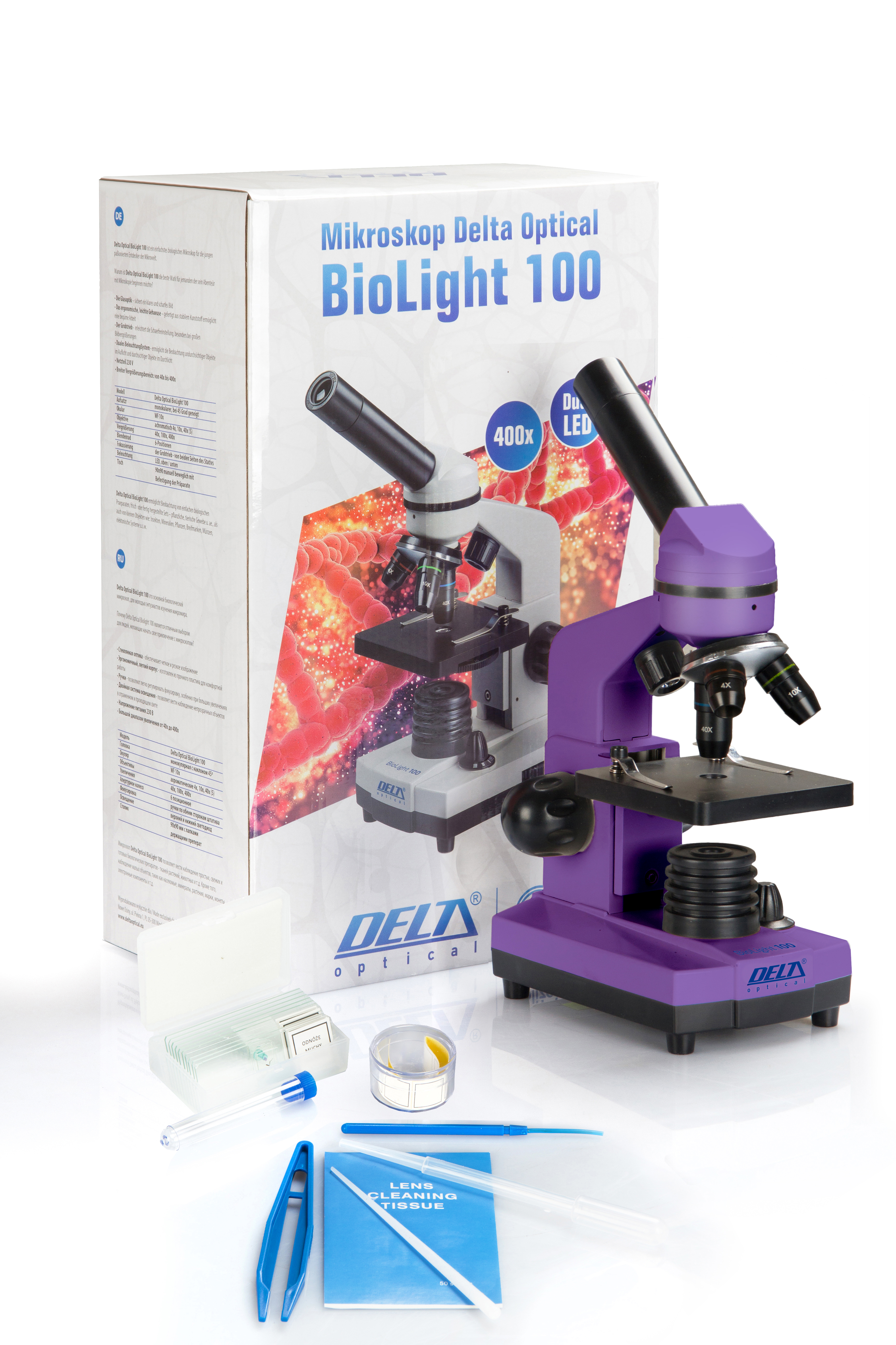 Mikroskop Delta Optical BioLight 100 Fioletowy (DO-3212) - 5 preparatów, szkiełka, zasilacz, dla początkujących