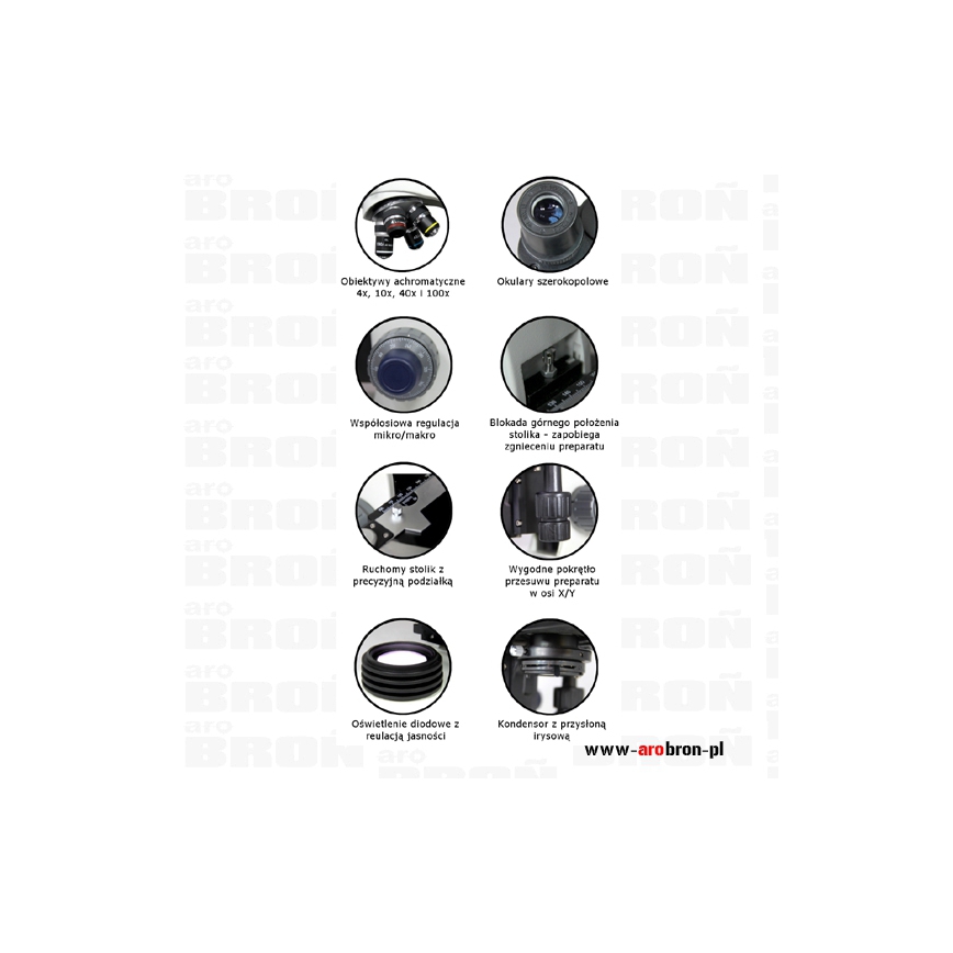 - Bardzo dobra optyka z obiektywami achromatycznymi 4x, 10x, 40x (amortyzowany) i 100x (amortyzowany i immersyjny). W zestawie standardowym mikroskop oferuje powiększenia 40x, 100x, 400x oraz 1000x. Dokupując dodatkowy okular 16x powiększenie maksymalne wzrasta do 1600x (maksymalne dla mikroskopu optycznego wg zasad fizyki).