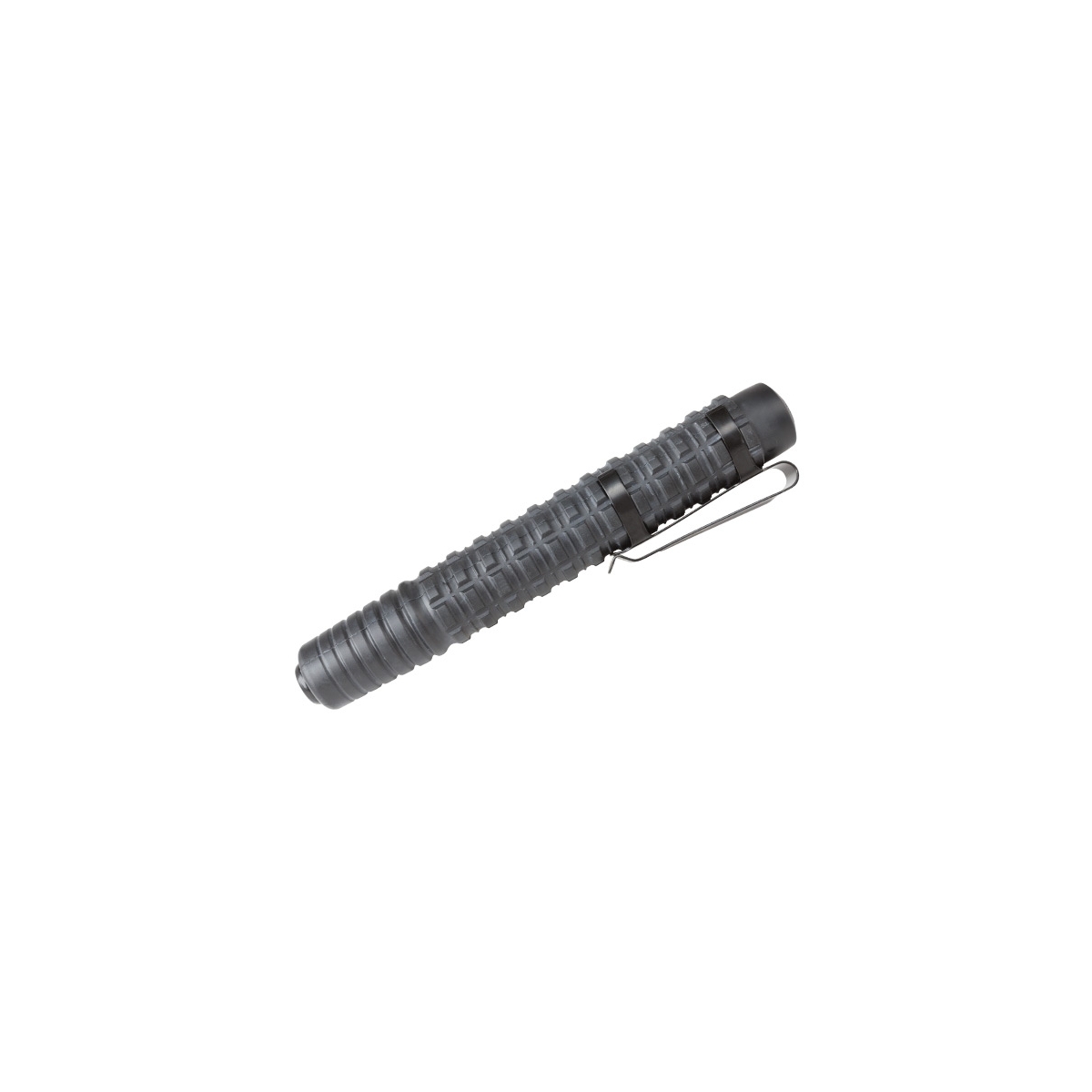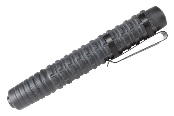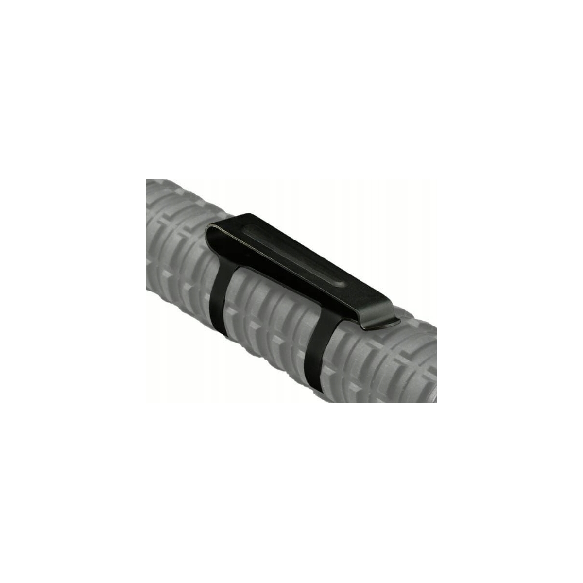 Metalowy zaczep długopisowy pozwalający na noszenia pałki zaczepionej o pas.