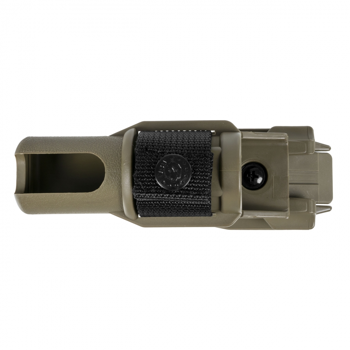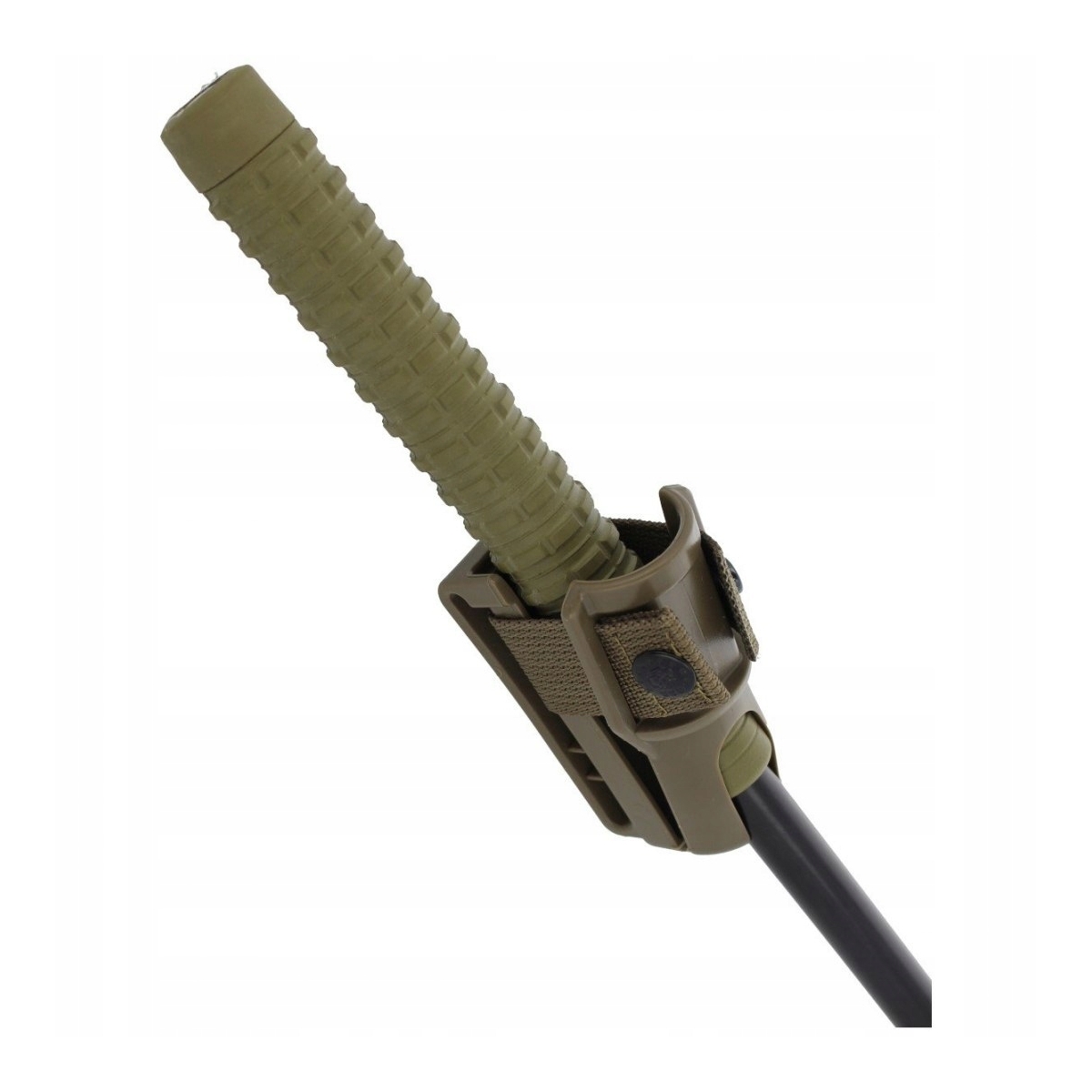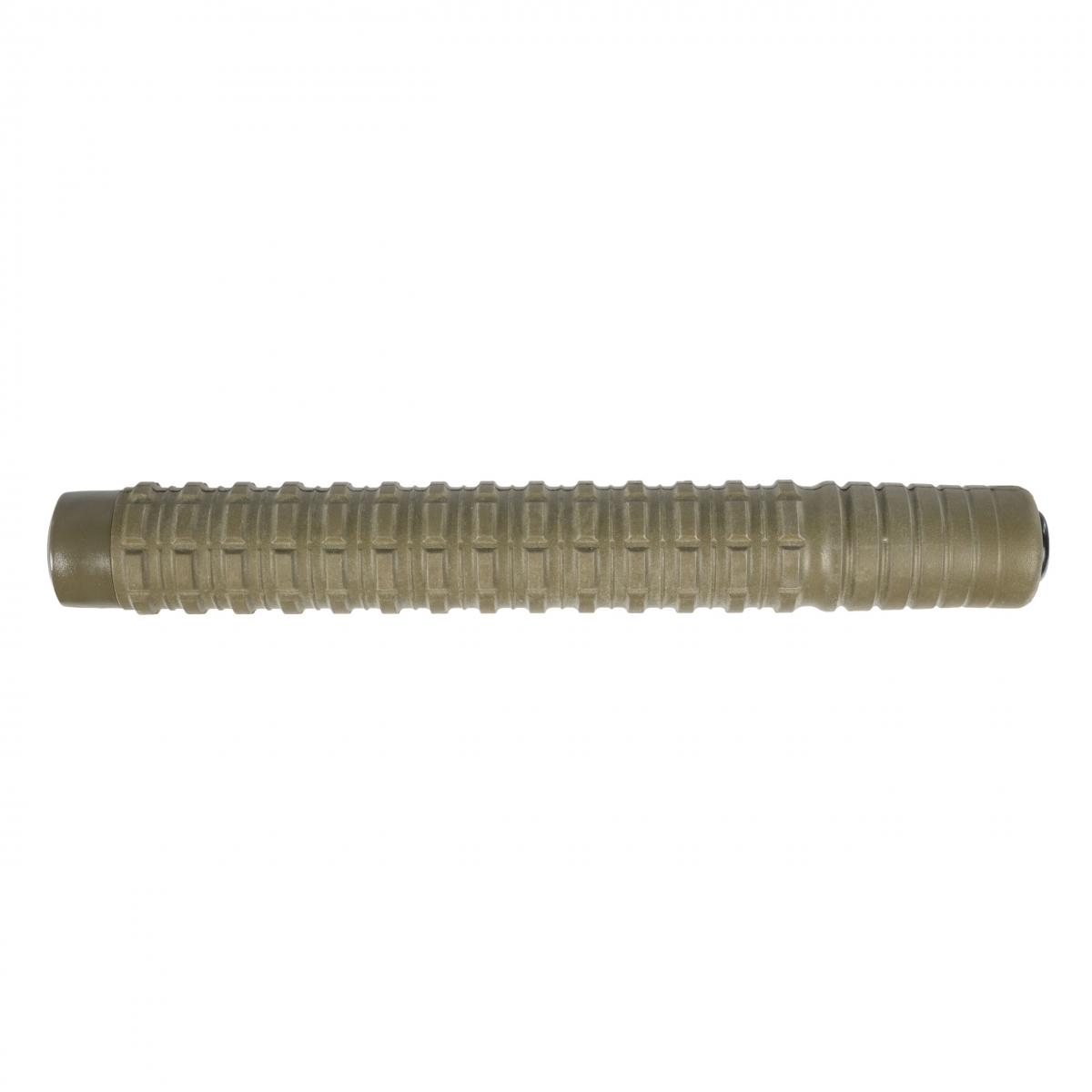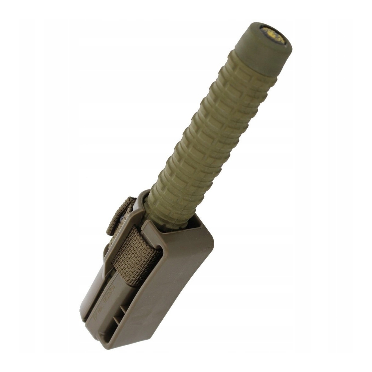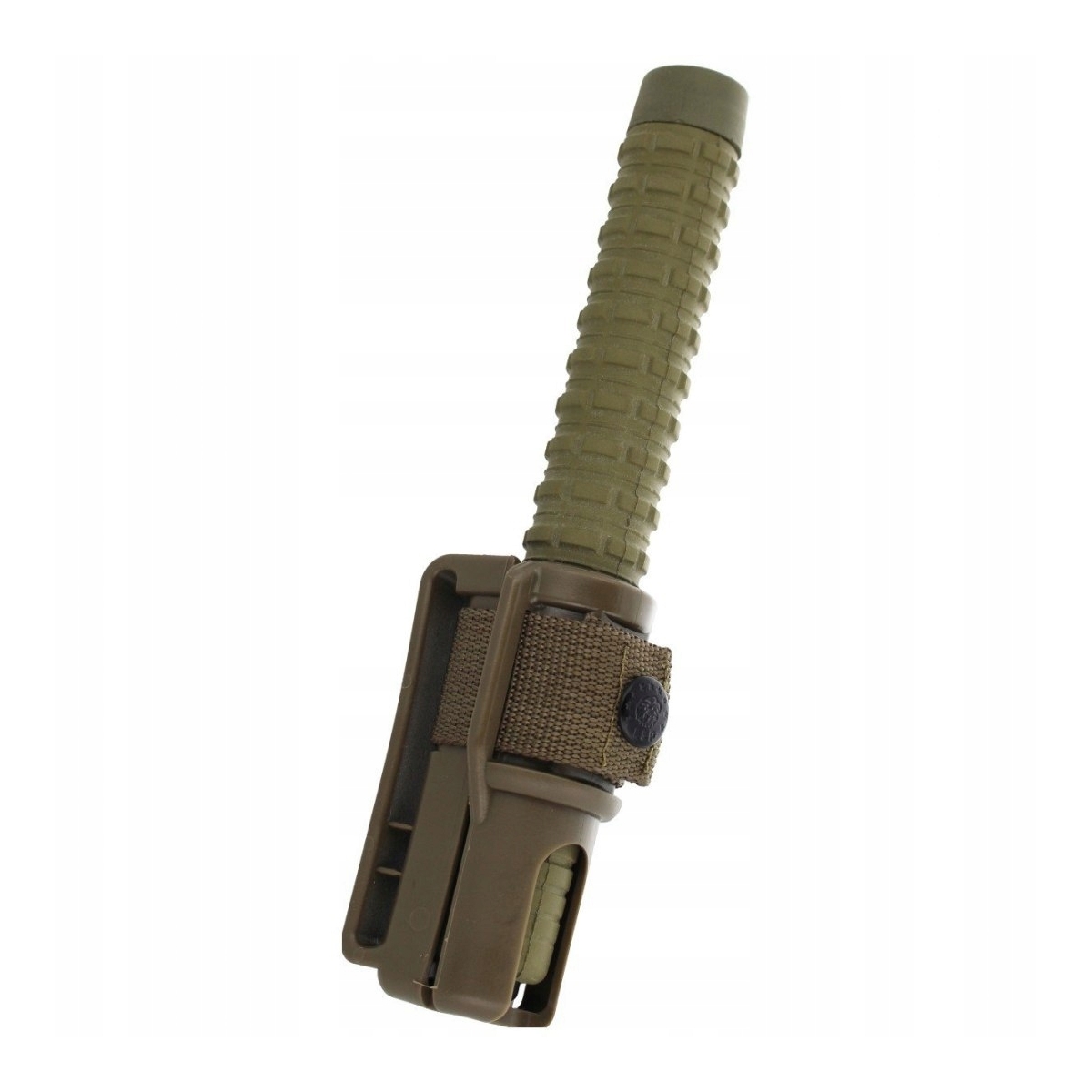 Zielona rękojeść z elastycznego tworzywa o antypoślizgowej fakturze zapobiega wyślizgiwaniu się pałki podczas użytkowania. Obrotowa kabura ze szlufką na pas pozwala na wygodne przenoszenie batona w stanie złożonym lub rozłożonym.