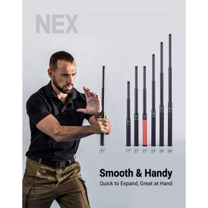 - Pałka teleskopowa wykonana z hartowanej stali z oryginalną blokadą NexLock zwalnianą za pomocą przycisku.