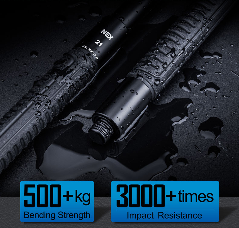 Poszczególne segmenty NEX Baton Steel wykonane zostały z wysokiej klasy stali hartowanej 42CrMo oraz aluminium 7075 stosowanego przy konstrukcji nośnych mostów oraz naczep ciężarowych.