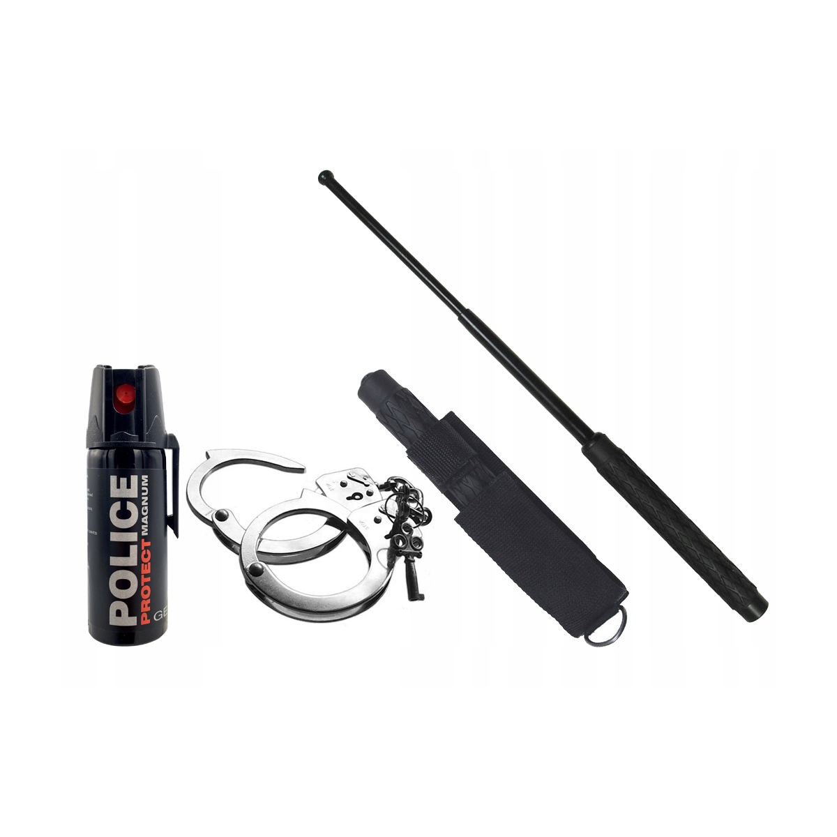 W zestawie: pałka MFH 21", nylonowy pokrowiec do pałki, kajdanki MFH, gaz pieprzowy Police Protect Magnum Gel.