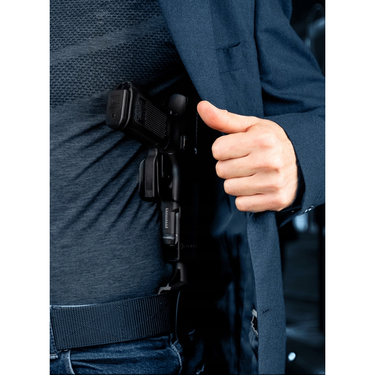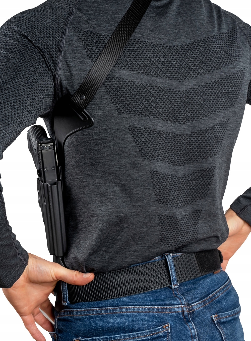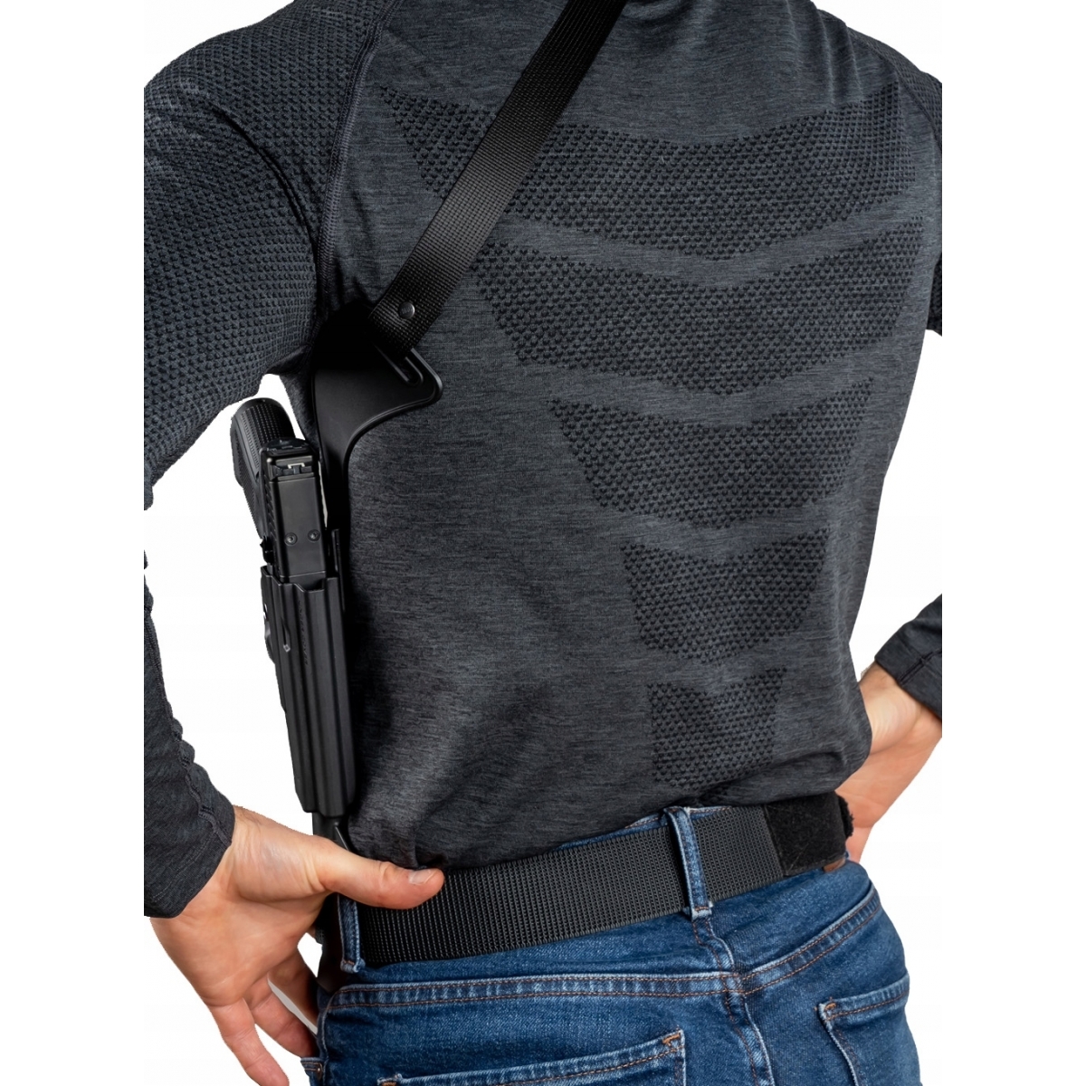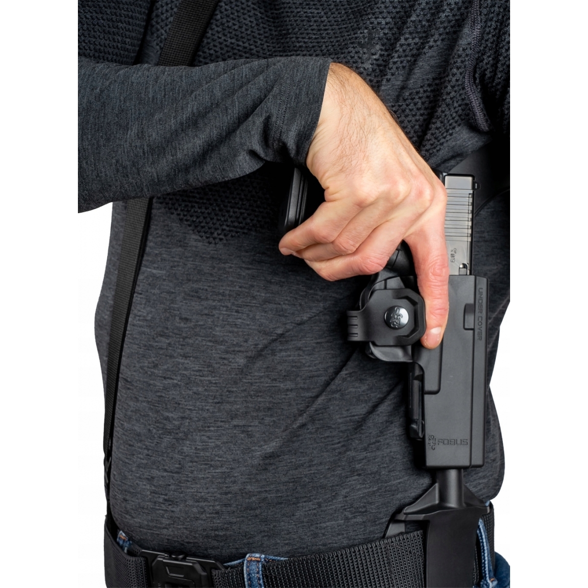 UnderCover to nowe spojrzenie od firmy Fobus na skryte przenoszenie broni pod pachą podobnie jak w klasycznych szelkach. W przeciwieństwie do kabur na ramię - UnderCover posiada jeden pas przytrzymujący oraz mocowanie na pasek, dzięki czemu cały ciężar nie spoczywa tylko na ramionach. Kabura pasuje do Glock 17 i 19 (również Gen.6) oraz CZ P10C