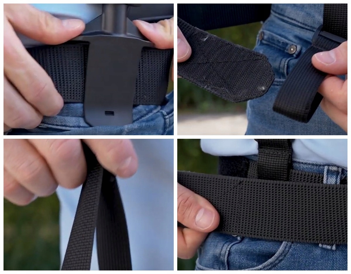 - Przełóż materiałowy pas przez prawe ramię od tyłu i zaczep o pasek spodni.