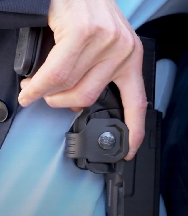 Aby wyciągnąć broń z kabury wystarczy jednym palcem odpiąć blokadę zatrzaskową.