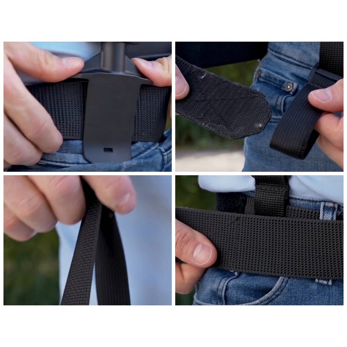 - Przełóż materiałowy pas przez prawe ramię od tyłu i zaczep o pasek spodni.