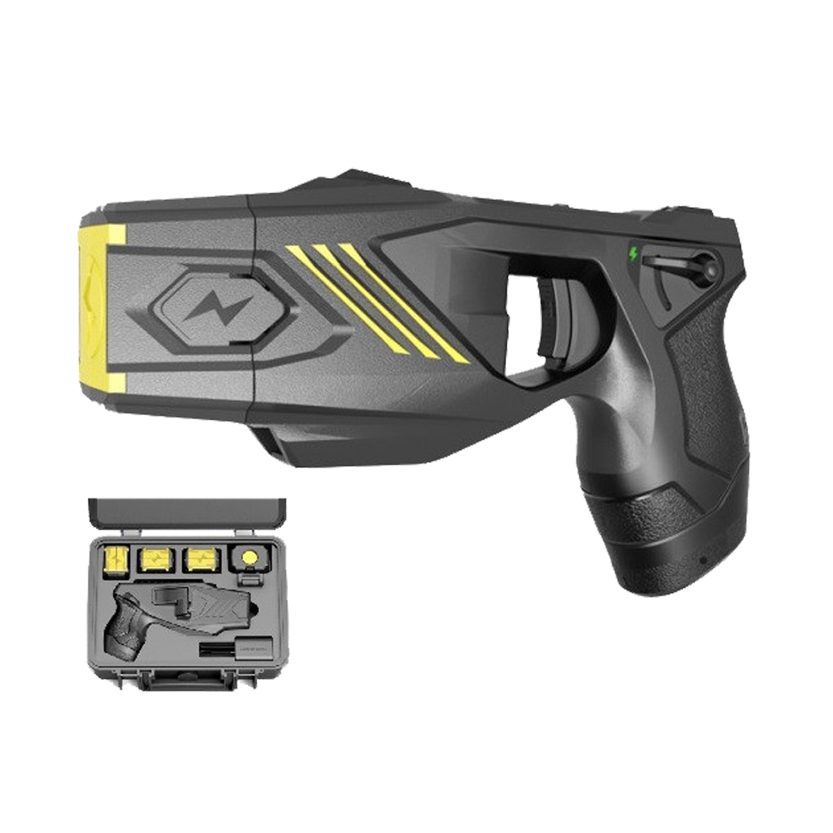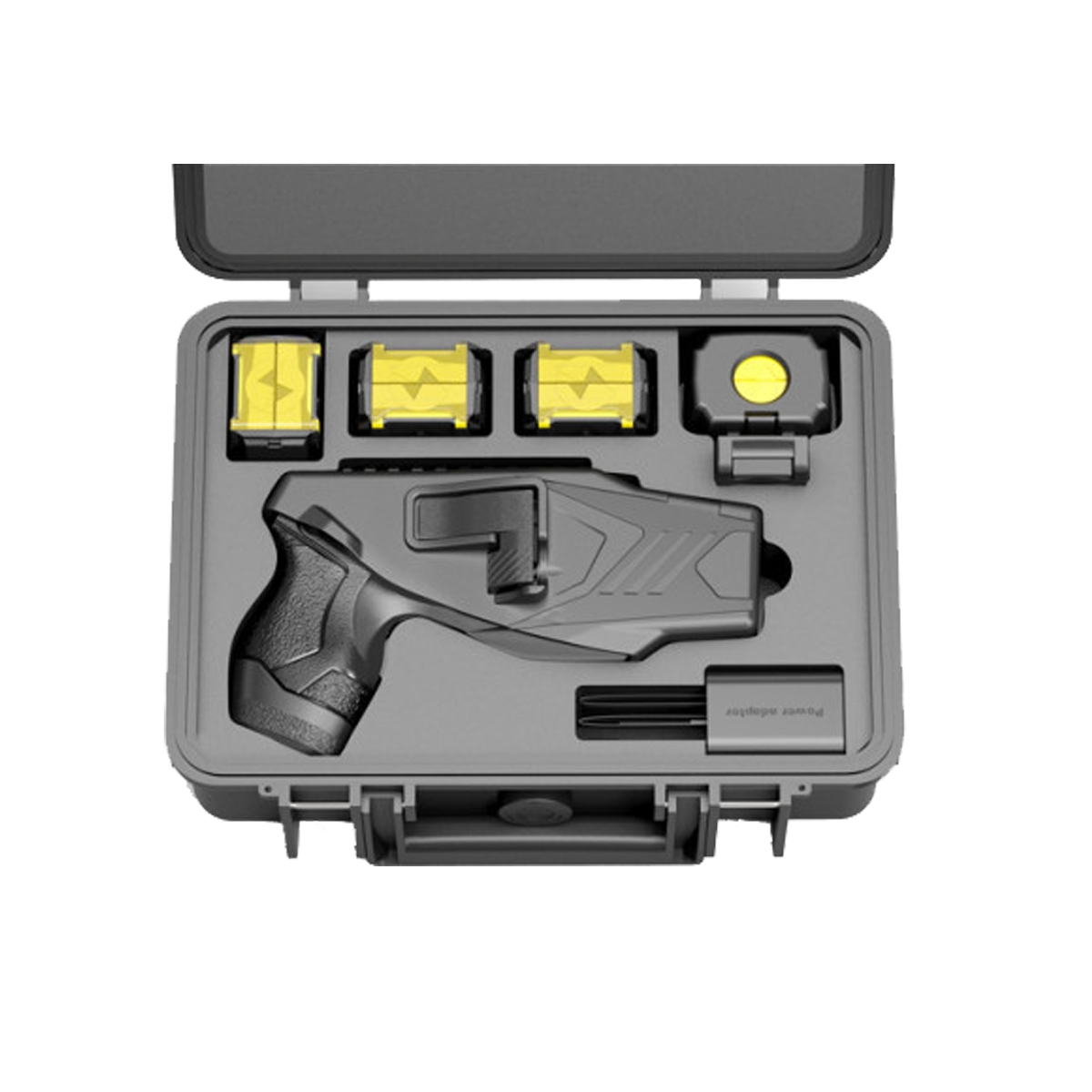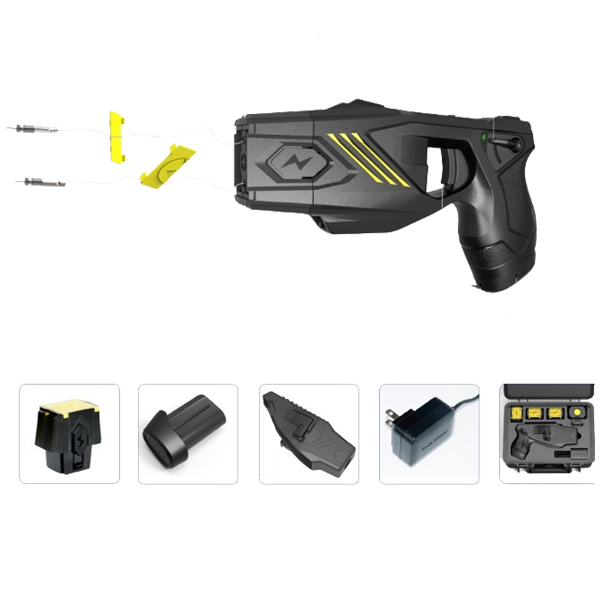 W komplecie z paralizatorem otrzymujemy walizkę, 4x kartridż o zasięgu do 6 metrów, kaburę na urządzenie, kaburę na zapasowy kartridż, akumulator, ładowarkę sieciową.
