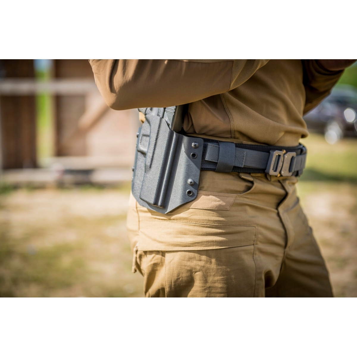 Klamra zamyka się na zatrzask, dzięki czemu pas nie rozepnie się podczas treningu bądź zawodów strzeleckich. Pas został usztywniony dla większej stabilności zamocowanych kabur lub/i ładownic. Jest kompatybilny z klamrami Tek-Lok®, jak i innymi systemami mocującymi oraz posiada zgodność PALS/MOLLE