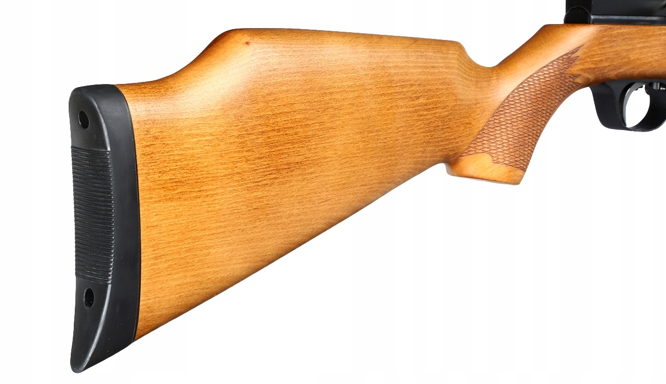 - Na zakończeniu kolby miękka gumowa stopka, która pozwala na wygodne i stabilne oparcie karabinka o ramię.