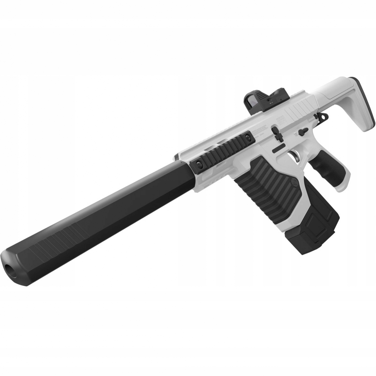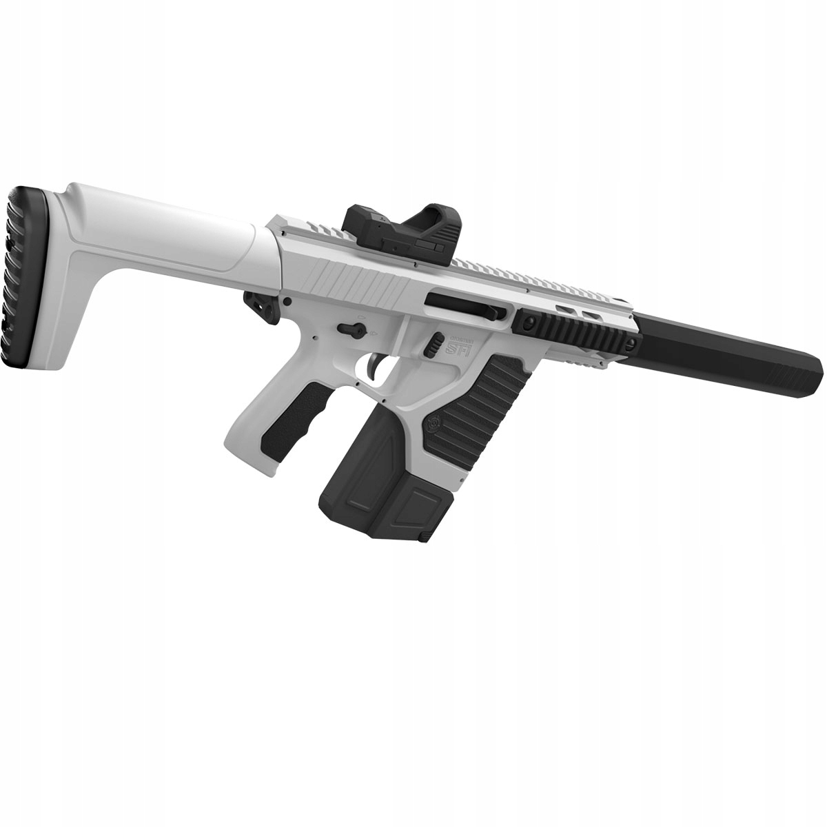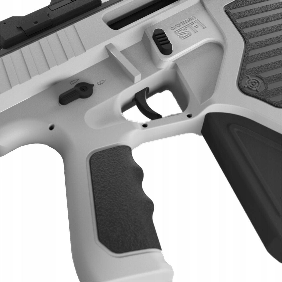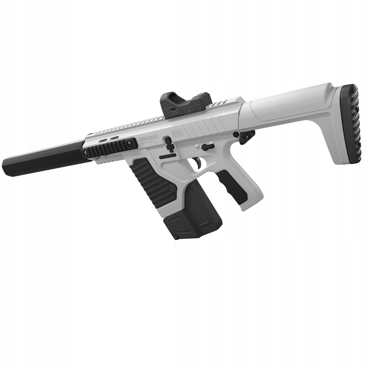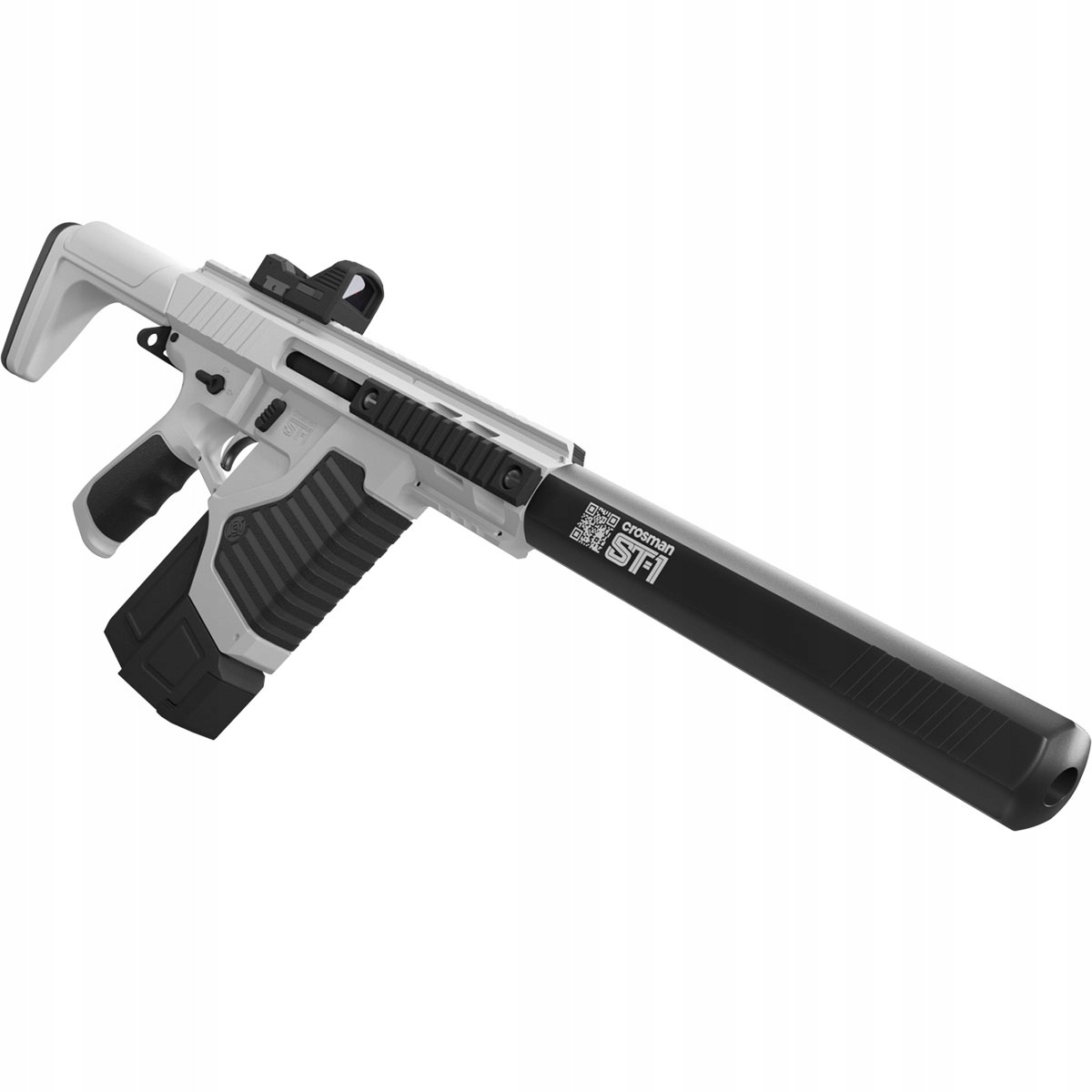 Wiatrówka Karabinek Crosman Full Auto ST1 - wykonany z wytrzymałego tworzywa na bazie włókien nylonowych. Wzorowany na karabinkach AR-15/M4. Dzięki modułowej konstrukcji może zostać przekształcony w pistolet maszynowy. Grzbietowa szyna RIS umożliwia montaż urządzenia optoelektronicznego. Wiatrówka posiada celownik kolimatorowy typu Red Dot. Zespół frontowych szyn RIS daje możliwość montażu dodatkowego wyposażenia taktycznego.