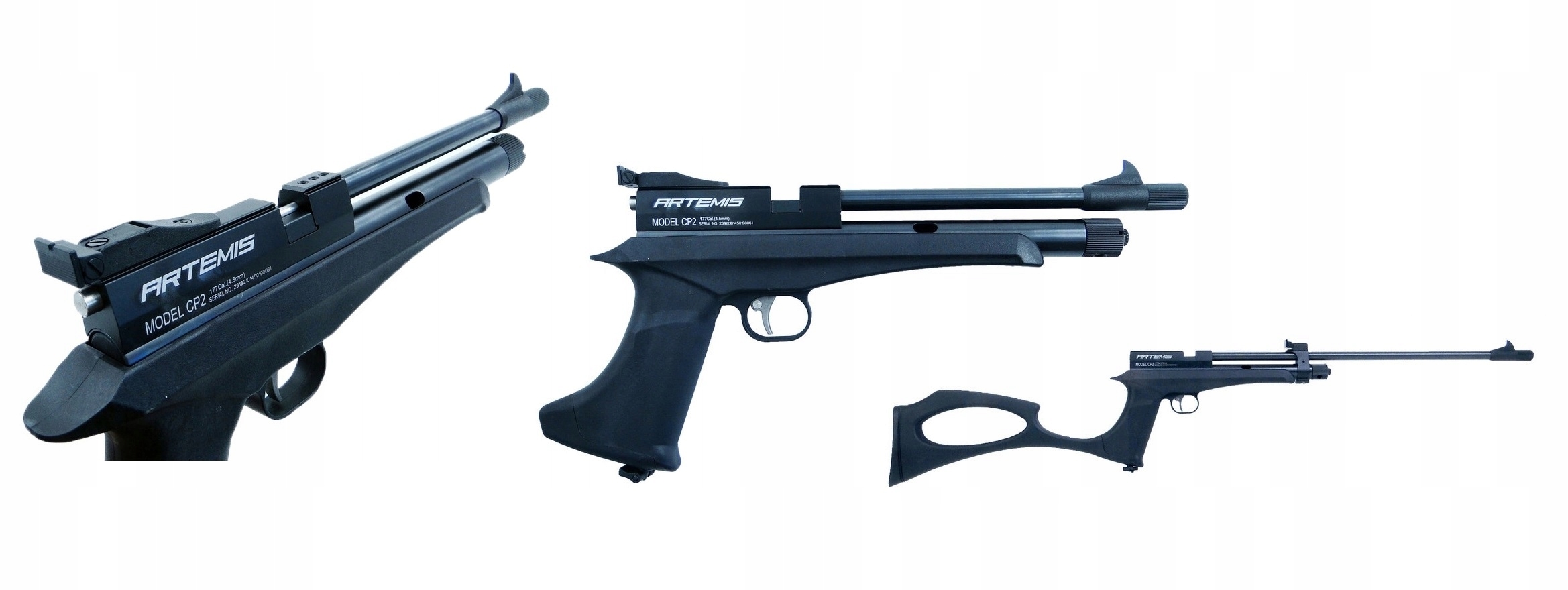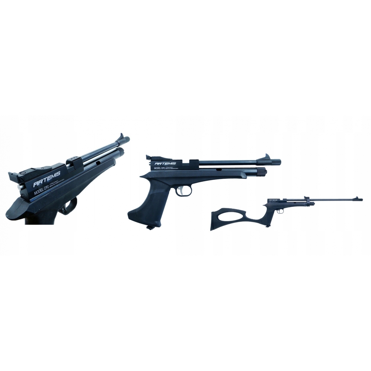 Wiatrówka karabinek Artemis CP2 kal. 5,5 mm czarny - to model w którym pistolet został tak skonstruowany, żeby w prosty i szybki sposób zmienić go na karabinek. Zmiana z pistoletu na karabinek polega na wymianie lufy (w komplecie są dwie) poprzez poluzowanie trzech śrub imbusowych oraz dokręceniu kolby. Należy również zdemontować szczerbinkę z pistoletu gdyż lufa karabinkowa została wyposażona we własną. CP2 został wyposażony w 7 - mio strzałowy samonapinający się magazynek oraz wkładkę umożliwiającą oddanie pojedynczego strzału, a w komplecie znajdują się 2 magazynki oraz w nakręcany tłumik. Elementy konstrukcyjny pistoletu Artemis CP2 jak lufa, zasobnik na co2 oraz spust zostały wykonane z metalu, co korzystnie wpływa na wytrzymałość oraz jakość produktu.