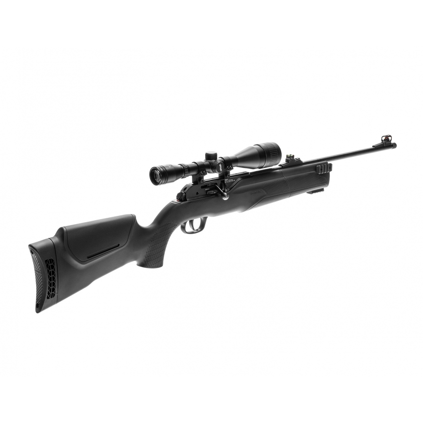 Wiatrówka HAMMERLI 850M2 Target Kit to najnowsza wersja cenionego karabinka na sprężone powietrze. Model ten zasilany jest za pomocą kapsuły CO2 88g. Wyposażony został w aluminiowy magazynek na 8 sztuk śrut diabolo 4,5mm. Różni się od poprzedniego modelu regulowaną baką policzkową, gwintem do tłumika na końcu lufy 1/2 20 UNF oraz trzema szynami na osadzie do montażu akcesoriów. Osada została wykonana z trwałego i mocnego polimeru. Komfort podczas oddawania strzału oprócz regulowanej baki zapewnia gumowana stopka znajdująca się na końcu kolby. Karabinek wyposażony został w światłowodowe stałe przyrządy celownicze. Automatyczny bezpiecznik chroni przed niekontrolowanym oddaniem strzału.