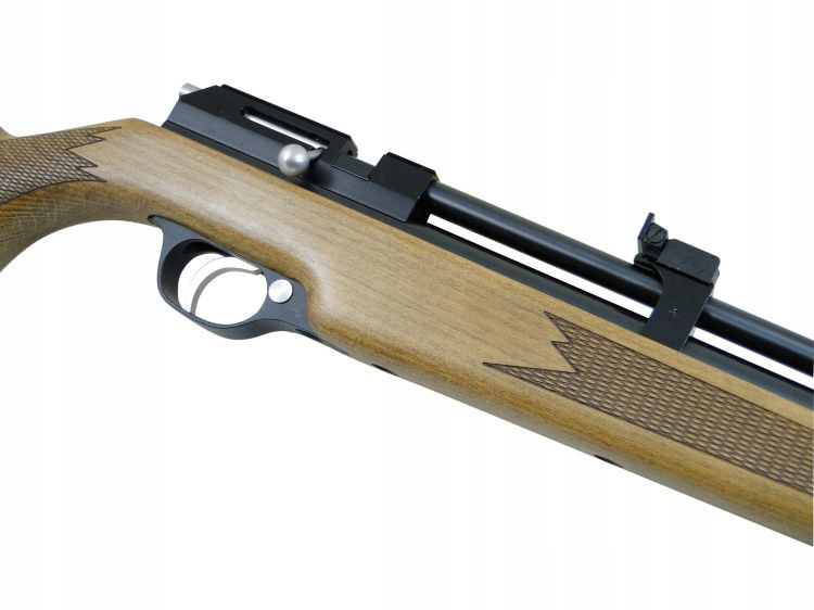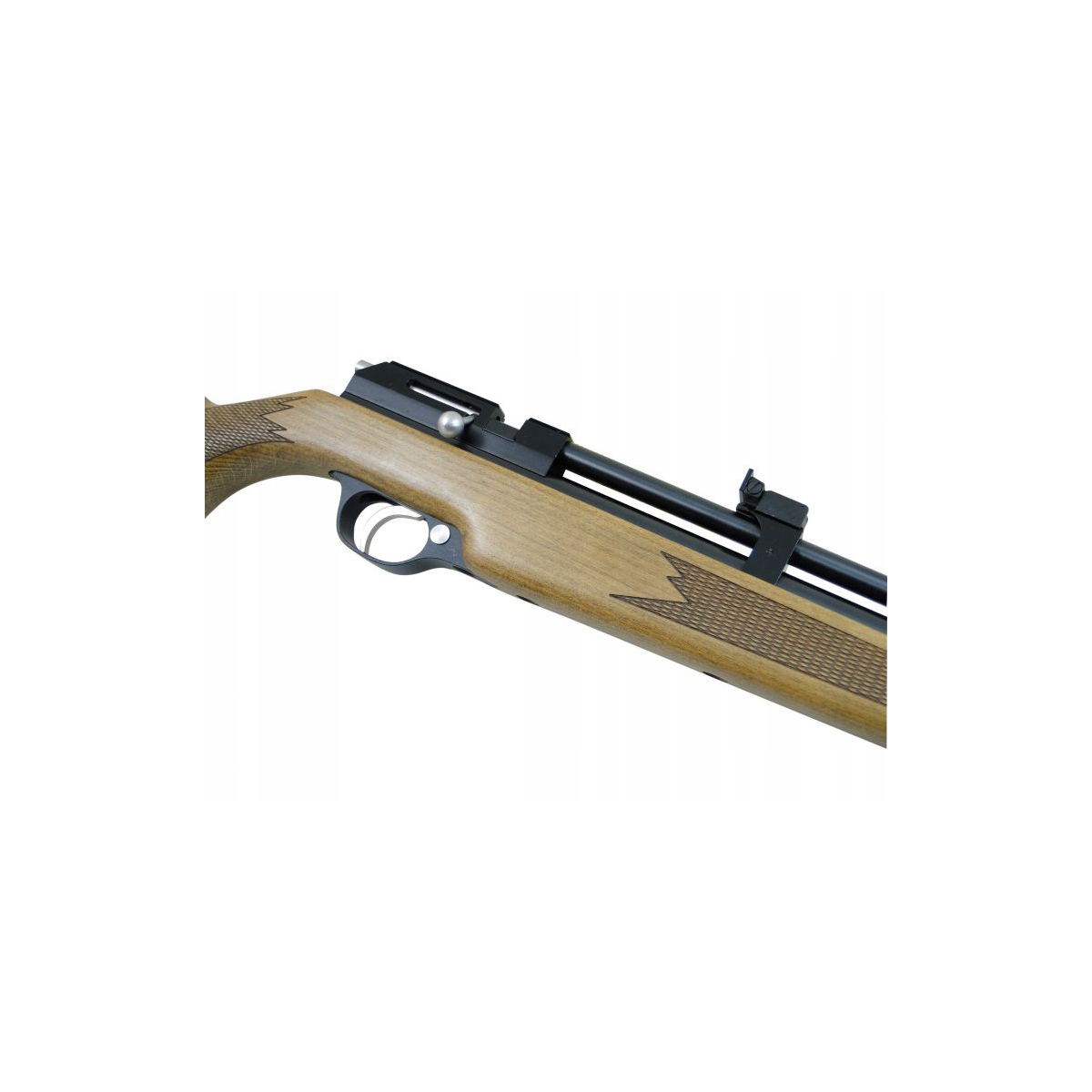 Karabinek wyposażony w szynę 11 mm na której bez problemu zamontujemy kolimator lub lunetę. Na lufie dodatkowo znajduje się muszka oraz zdejmowana szczerbinka. Atutem karabinka jest zintegrowany tłumik który znacznie wycisza pracę wiatrówki.