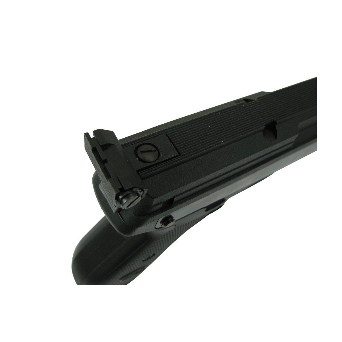- Linia celownicza w tym pistolecie ma długość ponad 24 cm. Muszka jest stała, a szczerbinka jest regulowana w pionie i poziomie.