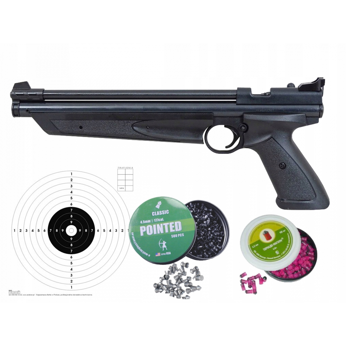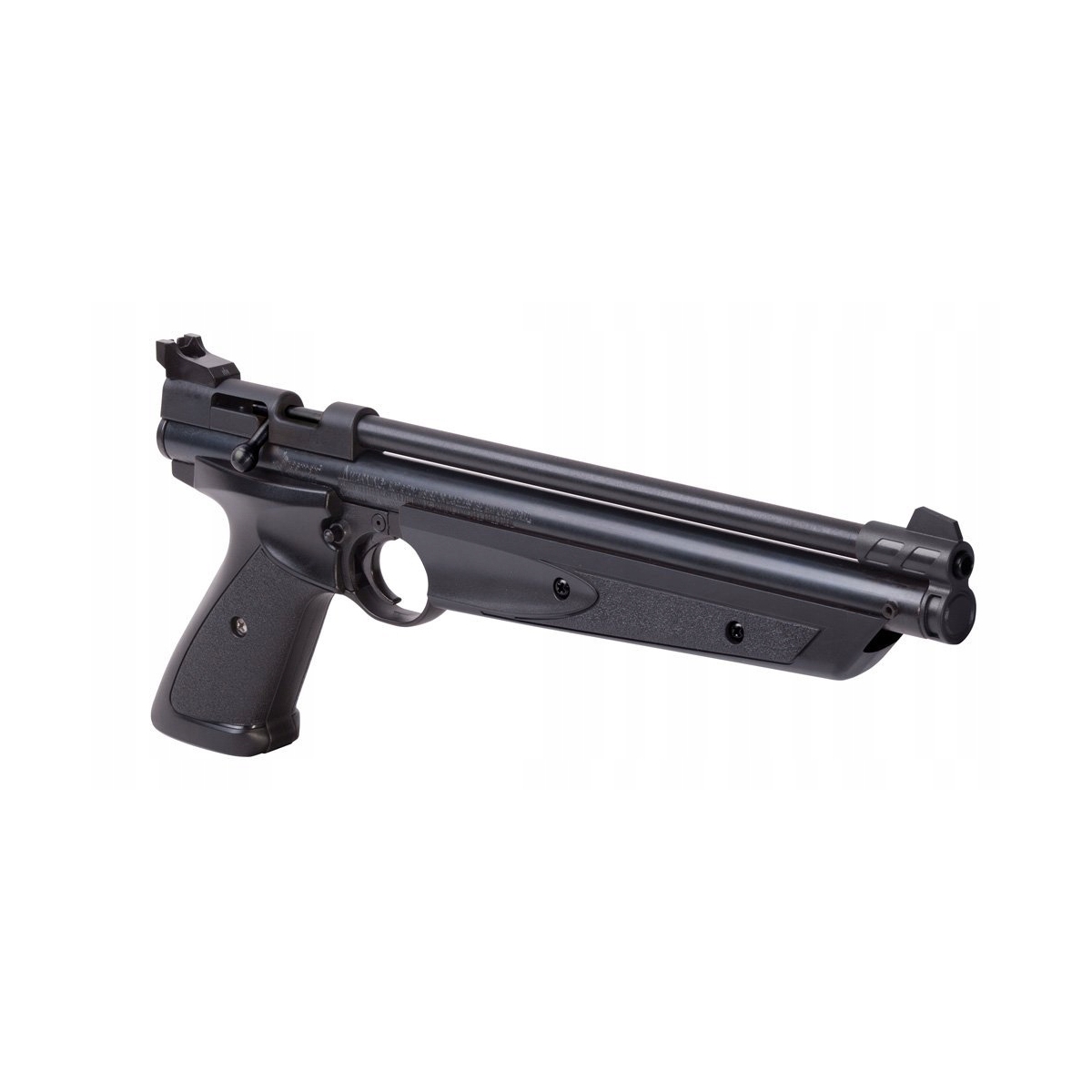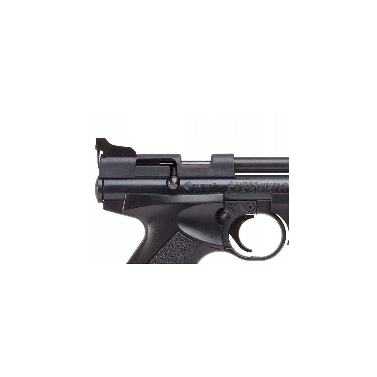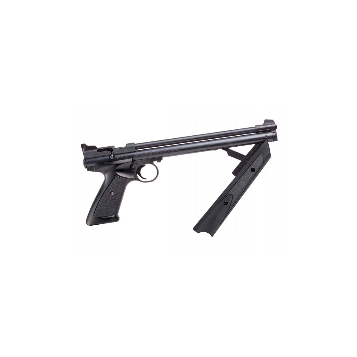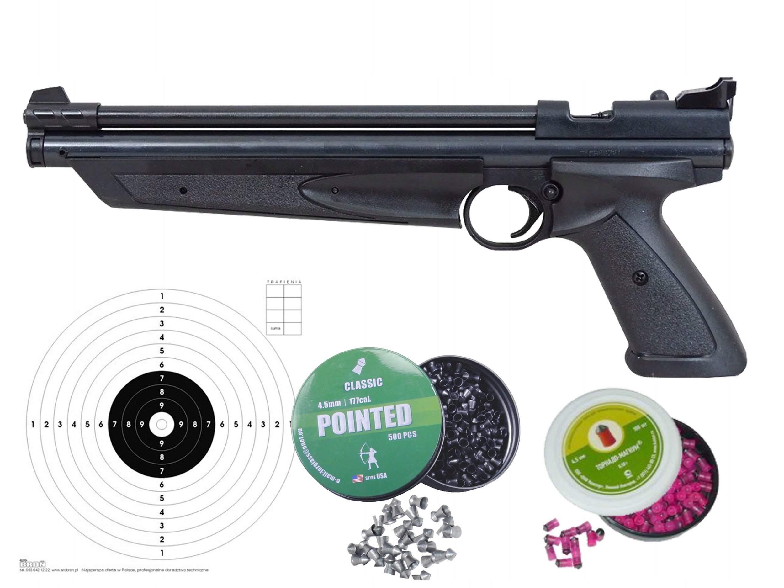 - Jednostrzałowy pistolet amerykańskiej firmy Crosman, ze stalową lufa gwintowaną kaliber 4,5 mm.