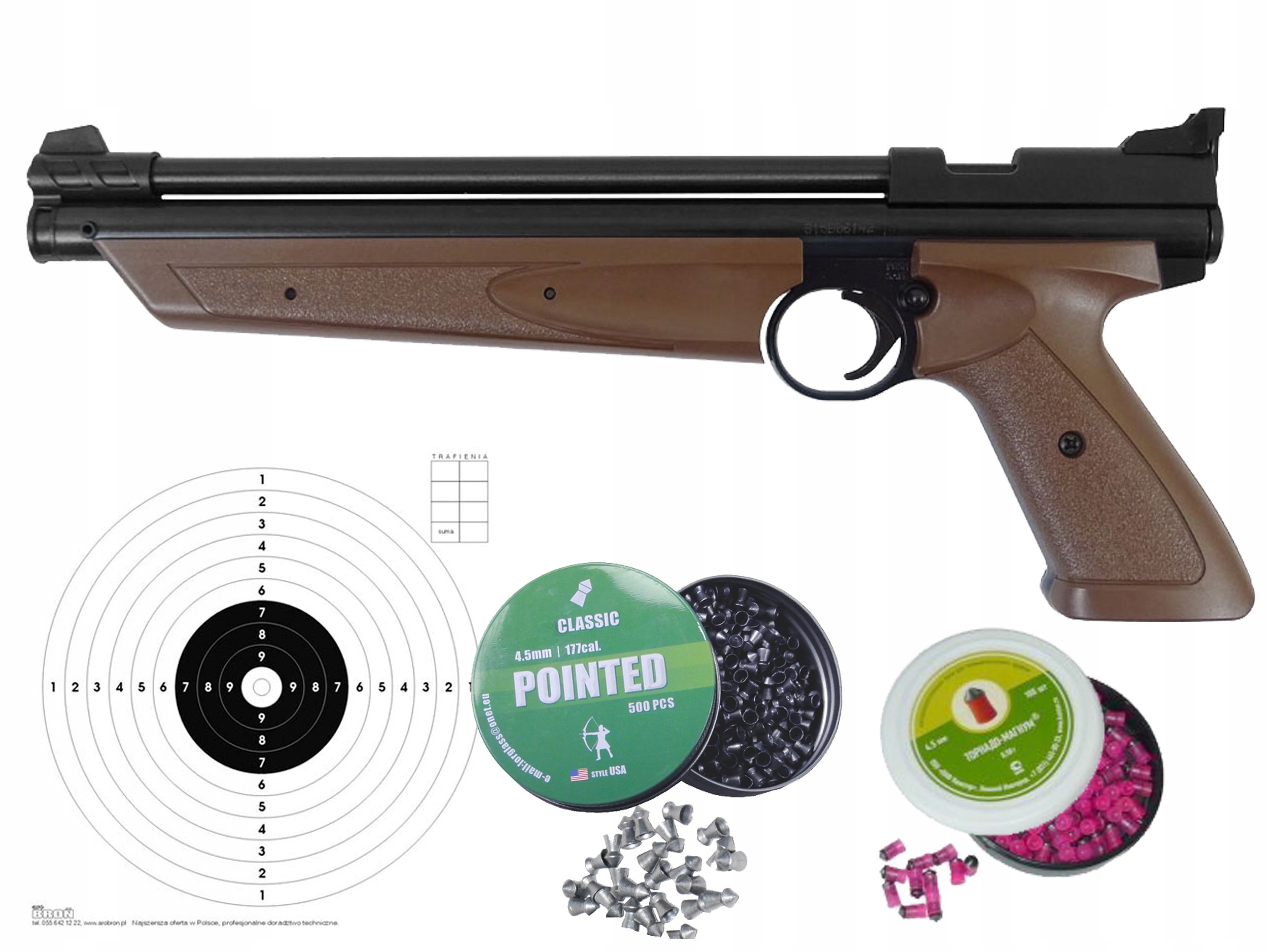 W zestawie: 250 szt śrutu 4,5mm, komplet tarcz 14x14 cm, 5 szt śrutu Tornado Magnum